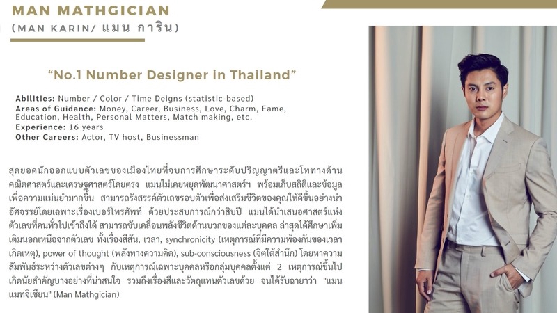 ศูนย์รวมนักพยากรณ์แบบครบวงจรแห่งประเทศไทย นำโดย คุณแมน การิน นักออกแบบตัวเลขอันดับ1 ตอบโจทย์สำหรับคนที่ต้องการวางแผนธุรกิจรอบด้าน การเงินการลงทุน เสริมดวงเรื่องความรัก ด้วยศาสตร์ตัวเลขสไตล์เฉพาะตัว ทั้งเบอร์โทรฯ เลขใต้บัตรประชาชน เลขมงคลรอบตัวเรา และการออกแบบภาพวอลเวเปเปอร์ ออกแบบภาพมงคลเฉพาะบุคคล พร้อมด้วยนักพยากรณ์ในสังกัดอีกมากมายหลายศาสตร์ให้บริการ