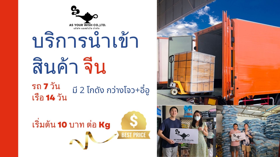 ประสบการณ์มากกว่า 500 ตู้คอนเทรนเนอร์ รับหาโรงงาน OEM สินค้าทุกอย่างในจีน บริการนำเข้าจีนทาง รถ และ เรือ ทำงานอย่างรวดเร็วและมืออาชีพ มีโกดังที่ จีน 2 ที่ กว่างโจว และ อี๋อู ออกใบภาษี ได้ เรามี บริการโอนหยวน ไม่มีขั้นต่ำ เราคำนวนราคาถึงหน้าบ้านท่าน ขั้นตอนการทำงาน 1. แจ้งความต้องการ 2. ลายละเอียดสินค้า 3. นำเข้าวันที่เท่าไร 4. ส่งปลายทางที่ไหน