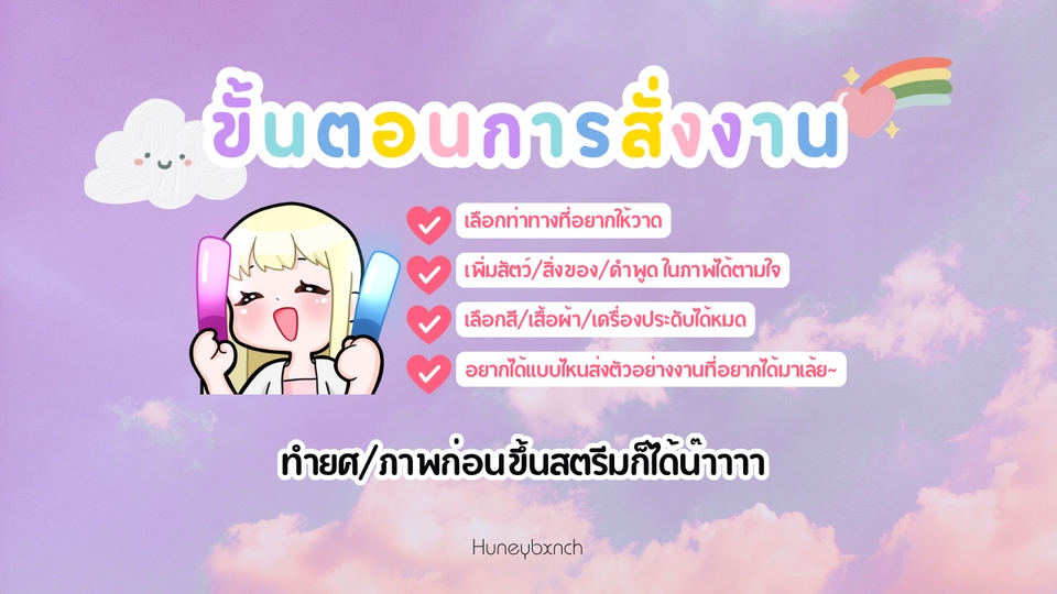 วาด/ออกแบบสติ๊กเกอร์และอีโมทบนแพลตฟอร์มต่าง ๆ เปลี่ยนตัวคุณเป็น Character ในสติ๊กเกอร์สไตล์น่ารักกก เปลี่ยนสีตา สีผม เสื้อผ้าได้ตามใจ! ☁️ รับทำทั้ง Twitch, Line, Discord ☁️ มีโมเดลให้เลือกกว่า 108 แบบ ไม่ต้องกังวลว่าจะคิดท่าโพสไม่ออก ☁️ ไฟล์ zip & PNG (ไม่มีไฟล์ PSD กับ AI) ☁️ ระยะเวลาการทำงานขึ้นอยู่กับคิวงาน ☁️ แก้ให้จนกว่าจะผ่าน (แก้ขนาดและคุณภาพ ไม่นับรวมดีเทล) ☁️ แก้ดีเทลได้ 2 ครั้ง (ลายเส้น 1 ครั้ง สี 1 ครั้ง) ขั้นตอนการทำงาน 1. แจ้งแพลทฟอร์มที่ต้องการนำไปใช้ (Line, Twitch, Discord) 2. บรีฟงาน กำหนดท่าทาง สีผม สีตา เสื้อผ้า 3. แจ้งวันเริ่มงาน ออกใบเสนอราคา 4. เริ่มงาน ร่างคาแรคเตอร์พร้อมลงสีให้ดู 1 ตัว (สามารถแก้ได้) 5. ส่งลายเส้นท่าทางทั้งหมดให้ตรวจ (สามารถแก้ได้) 6. ส่งงานทั้งหมดให้ตรวจ (สามารถแก้ได้) 7. ส่งไฟล์ Final ให้เป็นไฟล์ .png หรือ ลิงค์ Google Drive