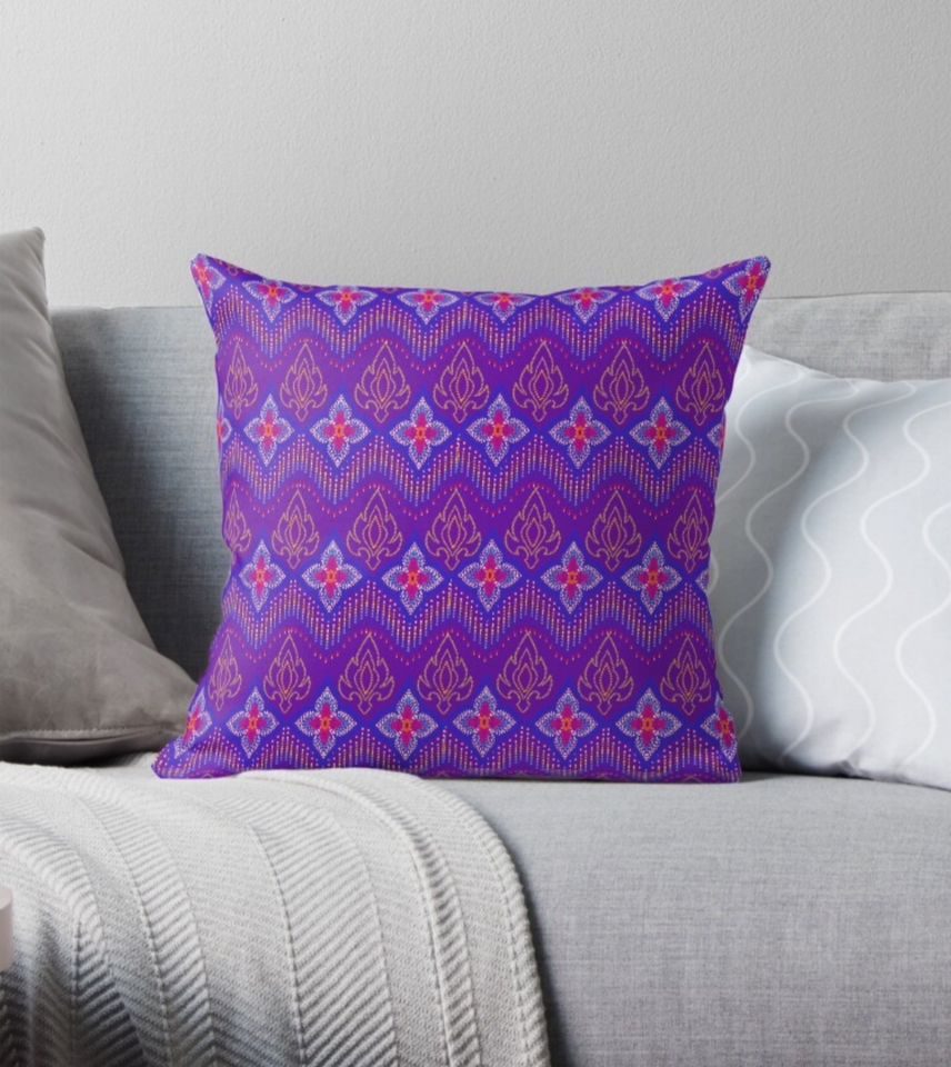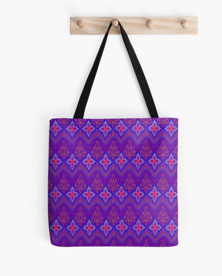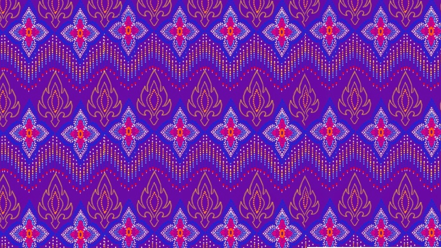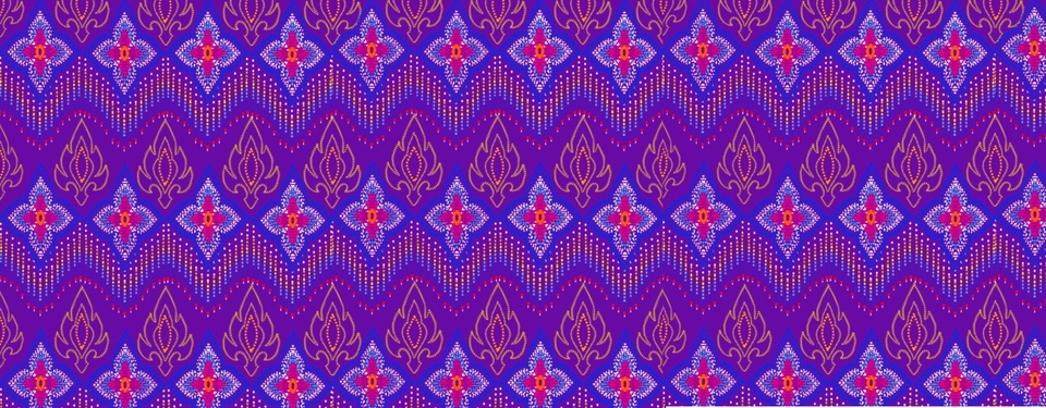 ลายผ้าไทยประยุกต์ที่ได้รับแรงบันดาลใจจากศิลปะลูกปัดมโนราห์ โดดเด่นด้วยการใช้สีม่วงแดง ส้ม และเหลือง เพื่อสร้างลวดลายที่สวยงามและมีเสน่ห์แบบไทยดั้งเดิม เสริมด้วยลายดอกไม้และลายเส้นอ่อนๆ บนพื้นหลังสีทองให้ความรู้สึกอบอุ่น เหมาะสำหรับการใช้งานทั้งในเสื้อผ้าและเครื่องประดับ สื่อถึงความงามแบบไทยที่มีเอกลักษณ์และร่วมสมัย"