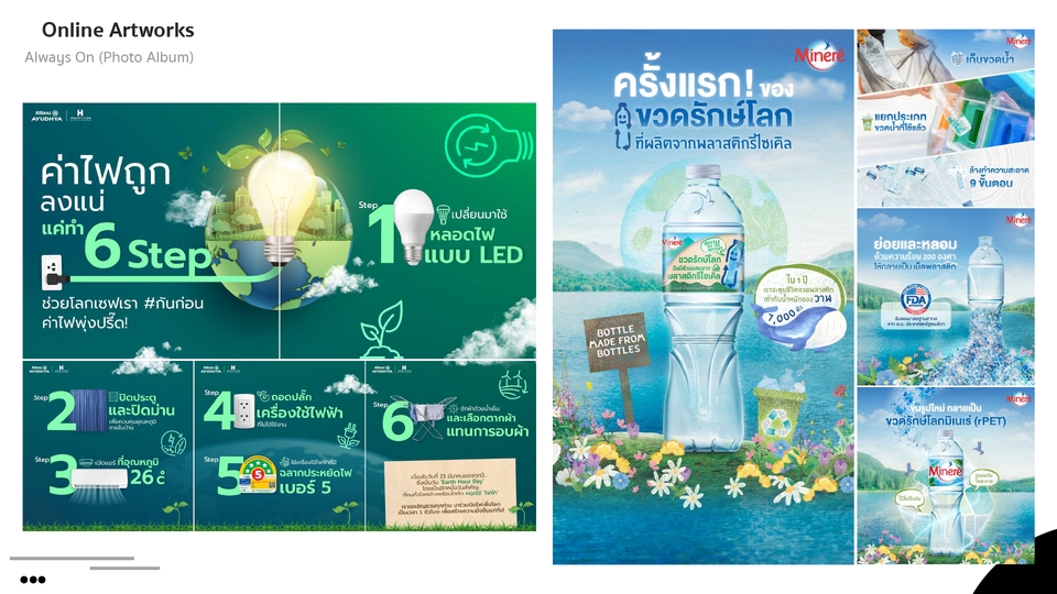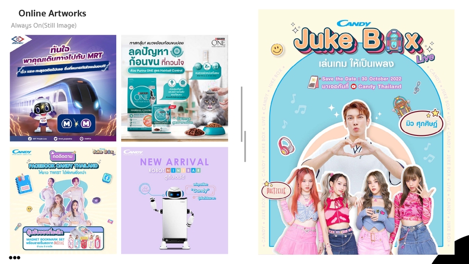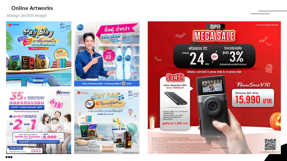 ฿18,000จำนวน 15 คอนเทนต์/เดือน ออกแบบ Artworks สำหรับ Online Content - Set A : จำนวน 9 ภาพ + 3 อัลบั้ม - Set A : จำนวน 6 ภาพ + 5 อัลบั้ม *จำนวนภาพไม่เกิน 5 ภาพ/อัลบั้ม **Resize(ปรับเพิ่มขนาด) คิดเพิ่ม 400 ต่อ 1 ไซส์ Platforms - Facebook (Banner | Online Content | Ads) - Line (OA | Voom) - IG หมายเหตุ *ไดคัท, รีทัช และตัดต่อตกแต่งภาพ ได้รับไฟล์ต้นฉบับ **งานทุกชิ้นใช้โปรแกรมและ photostock แบบถูกลิขสิทธิ์**
