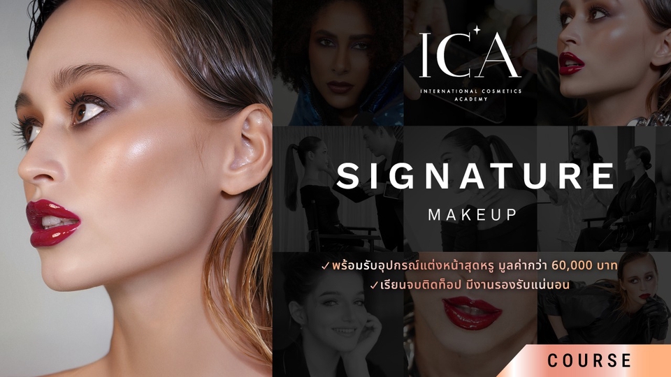 หลักสูตรแต่งหน้ามืออาชีพของเรามอบทักษะในทุกด้าน เพื่อให้คุณโดดเด่นกว่าช่างแต่งหน้าท่านอื่นๆ คุณจะได้รับผลงานภาพถ่ายเพื่อใช้เป็นภาพผลงานพร้อมใบประกาศนียบัตรที่รับรองโดยกระทรวงแรงงาน และสำหรับผู้เรียนที่มีผลงานที่โดดเด่น_ยังได้รับโอกาสในการทำงานกับเราหลังจบหลักสูตร_เราสอนทุกเคล็ดลับจากศูนย์จนถึงร้อย เพื่อมอบความพร้อมให้คุณในการเริ่มต้นอาชีพเป็นช่างแต่งหน้า หลังจบหลักสูตรเรายังให้บริการให้คำปรึกษาโดยไม่มีค่าใช้จ่าย ภายในระยะเวลาหนึ่งเดือนคุณจะก้าวเข้าสู่เส้นทางสายอาชีพที่คุณต้องการ ช่างแต่งหน้ายังเป็นที่ต้องการอย่างต่อเนื่อง ปูพื้นฐานงานผิว ✦ ผิวเป๊ะไร้ที่ติ: เจาะลึกเทคนิคการลงรองพื้นให้ผิวดูสมบูรณ์แบบ ✦ คอนทัวร์ & ไฮไลต์: สร้างกรอบหน้าให้ชัด_เป๊ะ_ มีมิติอย่างแม่นยำ สะกดทุกสายตาด้วยการแต่งตา ✦ เทคนิคอายแชโดว์: ปลดล็อกเคล็ดลับการเบลนด์และเลเยอร์สี สร้างลุคตาที่สะกดทุกสายตา ✦ อายไลเนอร์คมกริบ: ฝึกฝีมือการกรีดเส้นให้เฉียบคม ยกระดับการแต่งหน้าทุกสไตล์ สกิลการแต่งหน้าระดับโปร ✦ แต่งหน้าปรับได้ทุกสภาพผิว: พัฒนาความเชี่ยวชาญการแต่งหน้าให้เป๊ะปังบนทุกสภาพผิวและโทนสี ✦ เทคนิคเฉพาะทาง: ลับคมทักษะการแต่งหน้าขั้นสูงสำหรับหลากหลายโอกาสและสถานการณ์ สวยสะพรั่งสำหรับเจ้าสาว & งานราตรี ✦ แต่งหน้าเจ้าสาว: เนรมิตลุคคลาสสิก สง่างาม ถ่ายรูปสวยเป๊ะในวันสำคัญ ✦ Evening Glam: ครีเอทสไตล์แต่งหน้าสุดปัง หรูหรา มีระดับ สำหรับงานกลางคืนและอีเวนต์พิเศษ ลุคประจำวัน & แต่งหน้าสำหรับการถ่ายทำ ✦ แปลงโฉมจากกลางวันสู่กลางคืน: เรียนรู้การปรับลุคจากธรรมชาติใสๆ สู่สไตล์จัดเต็มได้ง่ายๆ ✦ แต่งหน้าสำหรับ TV Show: เก็บเกี่ยวเทคนิคเฉพาะทางสำหรับงานออกกล้อง เพื่อผลลัพธ์ที่เนียนกริบใต้แสงไฟสตูดิโอ อัปเดตเทรนด์ & การบริการลูกค้า ✦ นำเทรนด์อยู่เสมอ: อัปเดตสกิลให้เฉียบคมด้วยเทรนด์และนวัตกรรมใหม่ล่าสุดในวงการ ✦ ให้คำปรึกษาลูกค้า: พัฒนาทักษะการเข้าใจความต้องการ ให้คำแนะนำแบบมือโปร และมอบบริการเหนือระดับ ______________________________________________________________________________________________________________ Our professional makeup course offers a comprehensive experience that equips you with all the knowledge and skills to stand out in a competitive market. You’ll receive a professional makeup artist certificate recognized by the Thai Ministry of Labor, guaranteed job placement for top graduates, and professional photos for your portfolio. We’ll teach you every secret of the trade from start to finish, so you can begin your journey as a successful makeup artist the very next day. We also offer a free aftercare class. Within a month, you’ll kickstart your career in one of the most in-demand professions—there’s never “too much,” only growing demand. Fundamentals of Makeup Artistry ✦ Flawless Foundation: Master perfecting skin tone with expert foundation techniques. ✦ Contouring & Highlighting: Sculpt and define features with precision. Eye Makeup Mastery ✦ Eyeshadow Techniques: Unlock secrets to seamless blending and expert layering for captivating eye looks. ✦ Precision Eyeliner: Learn creating sharp, defined lines to elevate any style
