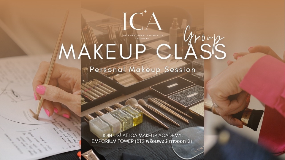 คลาสเรียนแต่งหน้าตัวเองแบบกลุ่ม | 10:00 น. - 14:00 น. ❤️ ไม่มีพื้นฐานสามารถเรียนได้ Open level ❤️ สอนตั้งแต่พื้นฐาน และการปรับใช้ให้เหมาะสมแต่ละบุคคลอง ❤️ รับคำแนะนำกับ International Trainers ❤️เครื่องสำอางค์พรีเมี่ยมจาก Limboss Beauty เตรียมให้ใช้ในคลาสเรียน ❤️ รับของขวัญพรี่เมี่ยมฟรี ❤️🔥 คลาสเรียน 4 ท่านขึ้นไป ❤️🔥 Workshop ภาษาอังกฤษ - ไทย สถานที่: ICA Makeup Academy. Emporium Tower ชั้น 24, BTS พร้อมพงษ์. (ทางออก 2) ———————— Personal Makeup Group Session - Duration: 3-4 hrs. - 10:00 AM - 2:00 PM What's Included: - Hands on training for flawless, professional looks. - Personalized feedback on your own makeup. - All necessary makeup and tools provided. - Luxury makeup gifts to take home. ✨Highlights: - Prefer to use your personal makeup tools? Feel free to bring them along!✅ - Meet new people and have fun in a vibrant group setting.👥 - Discover new techniques and high-quality makeup services in a supportive environment. - Enjoy your class with panoramic city views🏙️ - Indulge in free snacks and coffee☕️🍫🍬 - Unwind in our comfortable pantry area. Note: Workshops are conducted in English and Thai. The venue: ICA Makeup Academy. Emporium Tower, floor 24, BTS Phrom Phong station. (Exit 2) 📍Google Map: https://maps.app.goo.gl/LXJ89M9Uvy6FbJx38