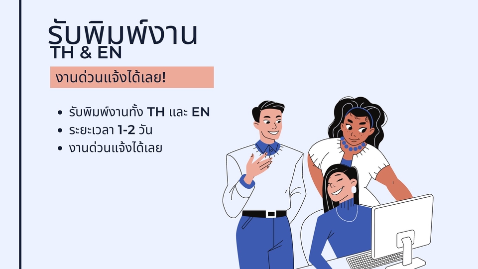 รับพิมพ์งาน TH/EN ใช้เวลา 1-2 วัน สามารถแก้ไขได้ 1 ครั้ง ส่งงานพร้อมกับไฟล์ word & pdf กรณีงานด่วยสามารถแจ้งได้ค่ะ