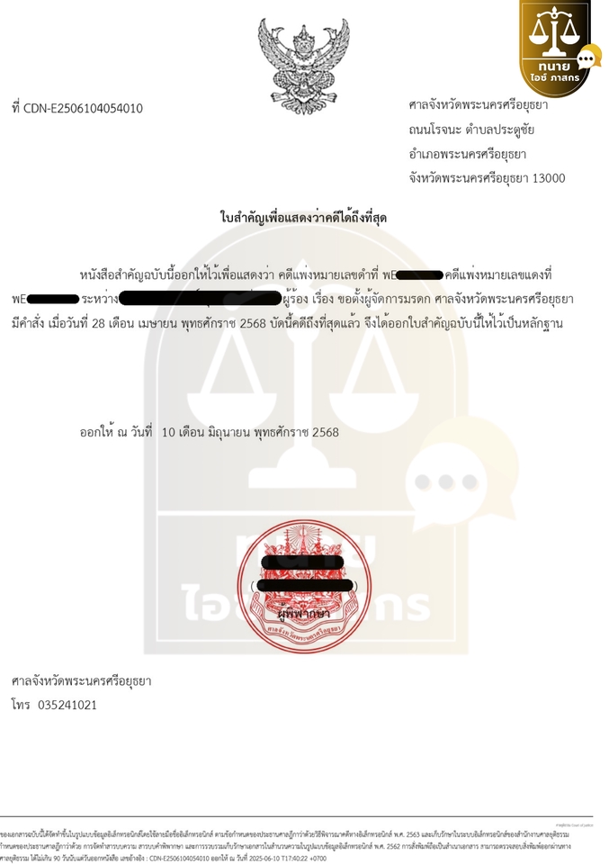 - • 4. เมื่อคำสั่งและหนังสือรับรองคดีออกแล้ว ทนายจะเป็นคนดำเนินการขอคัดให้ท่าน โดยที่ท่านไม่ต้องมาศาลเลย
