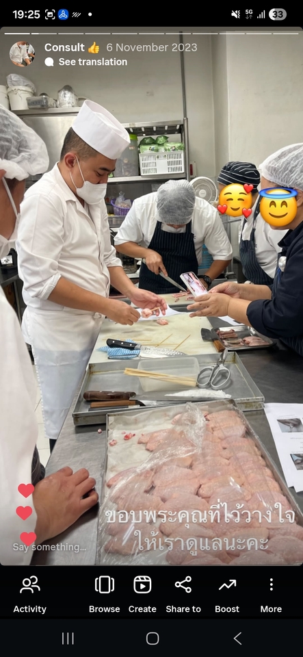 สอนทําอาหารญี่ปุ่น 1.) Home Cooking ทายที่บ้านง่ายๆ หลากหลายเมนู อาทิ ซาซิมิ ข้าวหน้าต่างๆ เทมปุระ ฯลฯ 2.) พื้นฐานอาหารญี่ปุ่นแบบต้นตำรับ 3.) อาหารญี่ปุ่นแบบต้นตํารับแบบมืออาชีพ 4.) วางโครงสร้างร้านอาหารญี่ปุ่น ออกแบบเมนู คำนวนต้นทุน ,ตั้งคิดราคาขาย 5.) ฝึกอบรมพนักงานครัว เสิร์มทักษะอาหารญี่ปุ่น