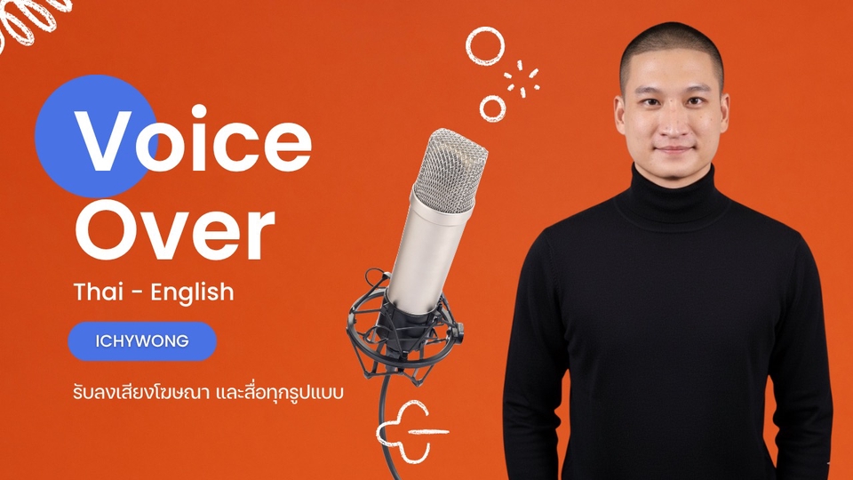 รับงานลงเสียง Voice Over ไทย - อังกฤษ สื่อทุกประเภท รายละเอียดบริการ: - ลงเสียง Spot โฆษณา - TVC | สารคดี - Presentation | Infographic | Audiobook - เสียงตอบรับอัตโนมัติ - สื่อประชาสัมพันธ์ทุกประเภท ตัวอย่างงาน (ไทย) - https://drive.google.com/file/d/1le1vN8U2W3jwqMDznV2CXYiAmUi3P2TZ/view?usp=sharing ตัวอย่างงาน (Eng) #1 - https://drive.google.com/file/d/1bojBq9Zj6x6dIRuABXZbBD4j4yeWMGaL/view?usp=sharing ตัวอย่างงาน (Eng) #2 - https://drive.google.com/file/d/1m29eUPbgZFA5vxFhrtaihhU0sQJr-ePa/view?usp=sharing ตัวอย่างงาน VO บน Online Content - https://www.tiktok.com/@ichywong ประสบการณ์ - ทำงานวงการบันเทิงในด้านการใช้เสียงมากว่า 8 ปี ทั้งการร้องเพลง ลงเสียงโฆษณา พิธีกรข่าว และงาน Event ต่างๆ ราคา - ขึ้นอยู่กับความยาวและความซับซ้อนของ Script โดยราคาใน Fastwork จะเป็นเรทเริ่มต้น สามารถพูดคุยปรึกษากันก่อนได้ครับ *ราคานี้ คือการอัดจากบ้าน ส่งไฟล์ WAV ผ่าน GoogleDrive ครับ อุปกรณ์บันทึกเสียง - Shure MV7 - Shure Motiv Mix ขั้นตอนการทำงาน 1. รับบรีฟจากลูกค้า (รายละเอียดงาน, เป้าหมายการใช้งาน, รูปแบบสื่อ, อารมณ์และสไตล์เสียงที่ต้องการ ฯลฯ) 2. ประเมินราคาและนำเสนอ โดยจะเริ่มงานเมื่อได้ข้อสรุปและรับชำระเงินเรียบร้อยแล้ว 3. ส่งงานตามกำหนด เป็นไฟล์ WAV ที่ไม่ผ่านการ Mix เสียง (ไม่เกิน 2 วัน นับจากสรุปราคา) 4. สามารถแก้ไขงานได้ 2 ครั้ง หากมีการแก้ไขครั้งที่ 3 เป็นต้นไป คิดค่าบริการเพิ่มครั้งละ 500 บาท และหากมีการเปลี่ยนสคริปท์หลังจากตกลงแล้ว อาจมีค่าใช้จ่ายเพิ่มเติม