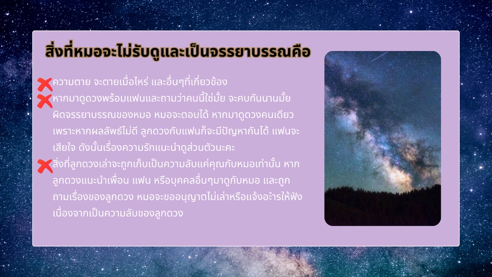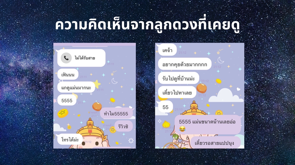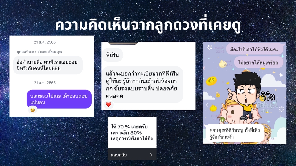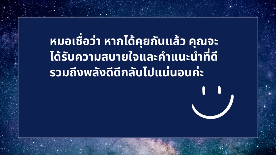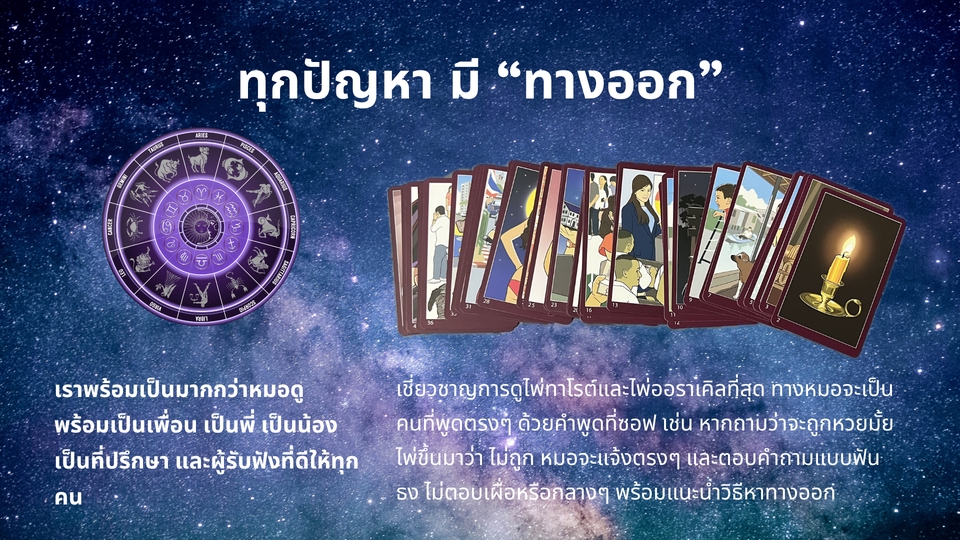รับดูดวง ดูจากไพ่ยิปซีไพ่ออราเคิล ประกอบกับดูพื้นฐานดวงเป็นหลัก ประสบการณ์มากกว่า 14 ปี จริงใจ ตอบตรงไม่อ้อมค้อม ฟันธงให้กับเส้นทางที่จะเลือก พร้อมเป็นทุกที่ปรึกษาแก้ปัญหาให้กับทุกคน สามารถดูเบอร์โทรศัพท์เลขทะเบียนรถ ฮวงจุ้ย ลายมือได้ เราเชื่อว่าหลังดูจบ จะได้ความสบายใจและวิธีการออกจากปัญหา พร้อมพลังบวกกลับไปอย่างแน่นอนค่ะ ทางหมอ มีจรรยาบรรณในการดูอยู่ สามารถดูได้ในportfolio ของหมอนะคะ