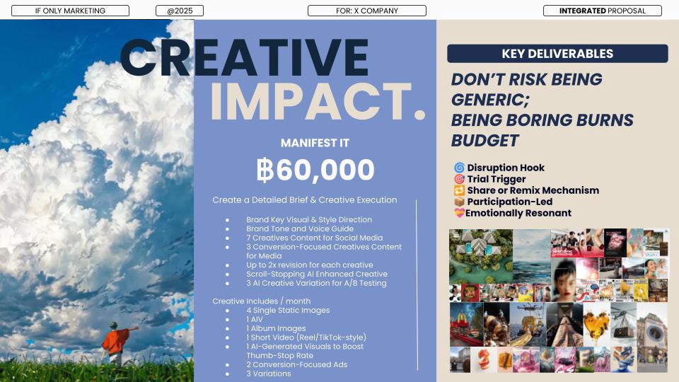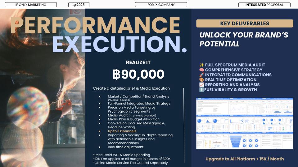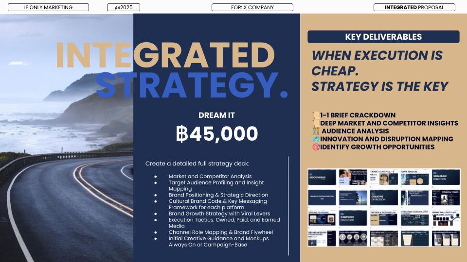 ฿60,000We shape your brand’s identity through creative direction, visuals, and messaging. Deliverables: Creative deck, 6 brand-ready assets, visual assets, content calendar, and messaging one-pager.