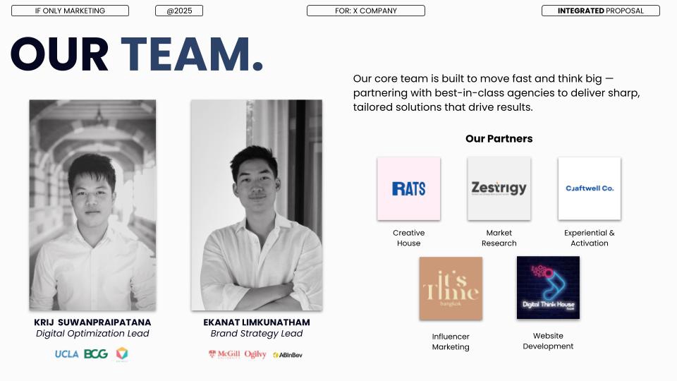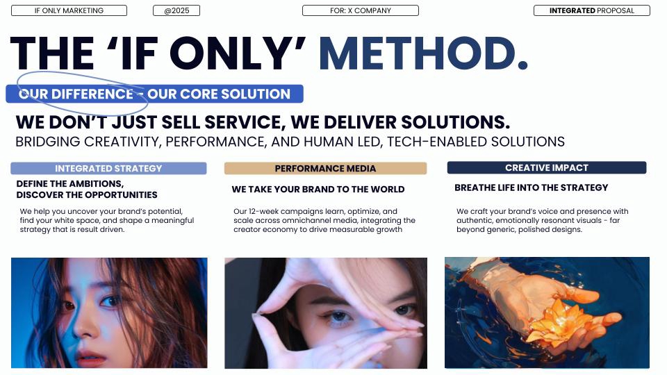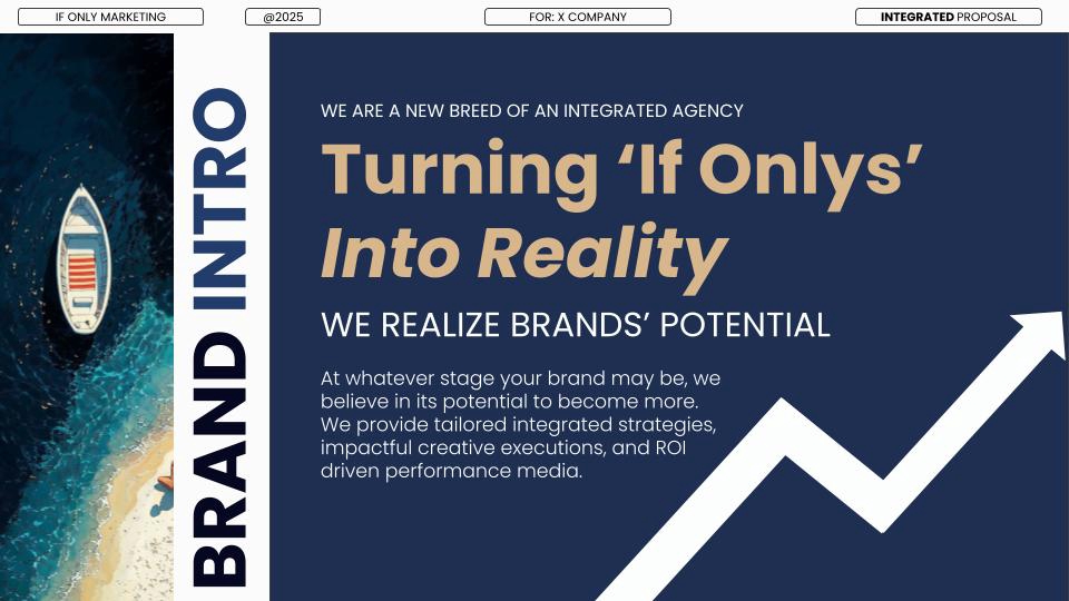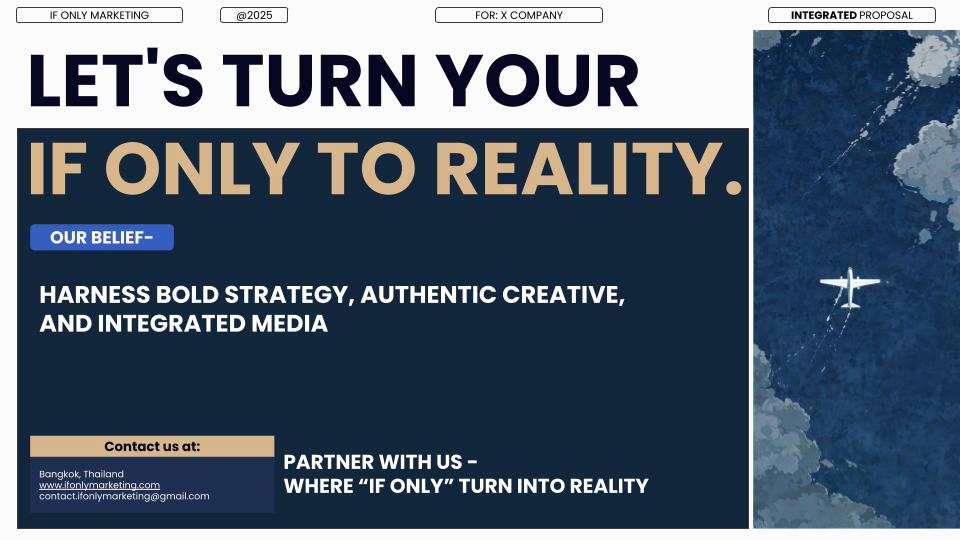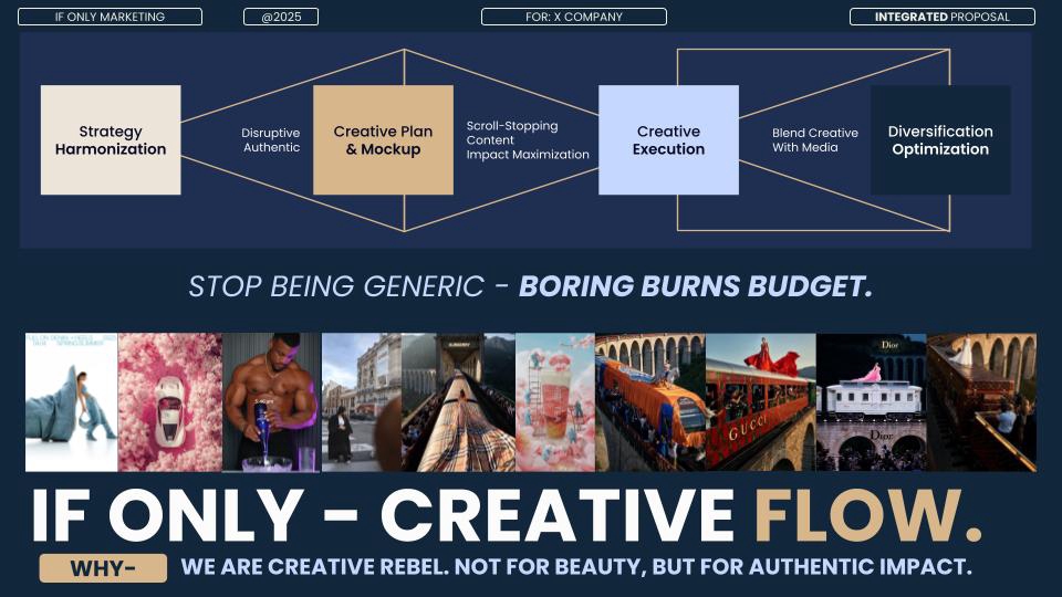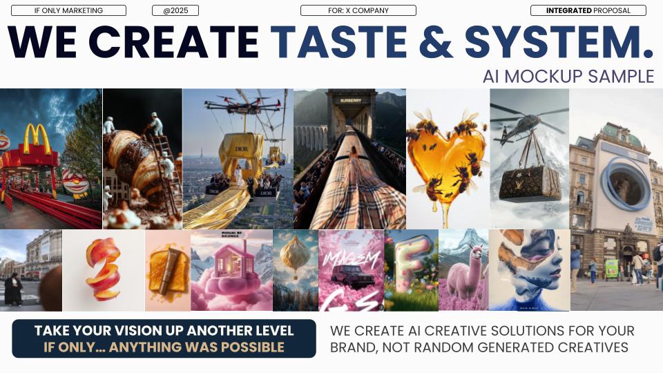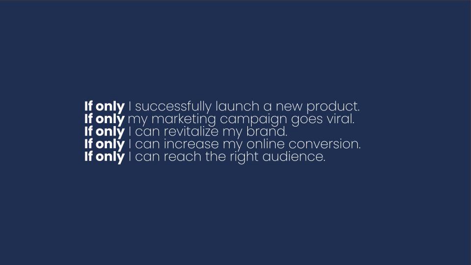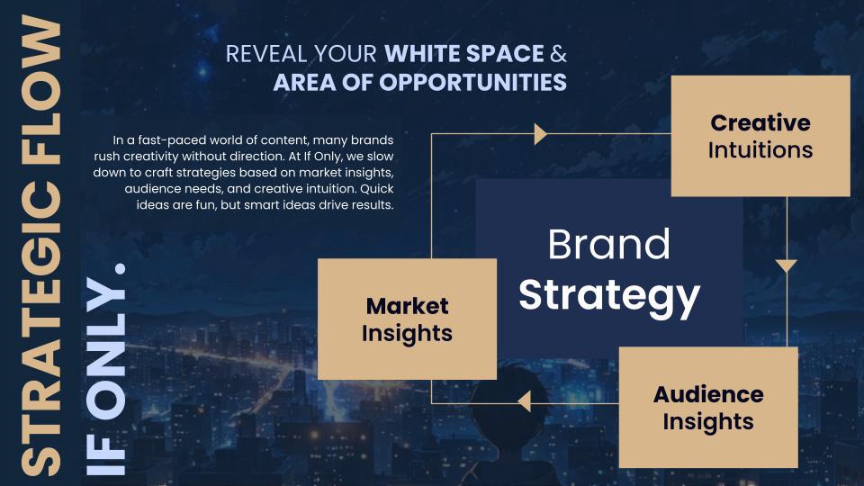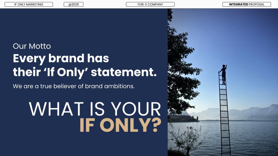 The IF ONLY Method At If Only, we don’t just build brands—we unlock possibilities. Every project starts with a simple question: “What’s your IF ONLY?” Then we go to work—turning ambition into action. 1. Dream It Define the ambition. Discover the opportunity. We help you uncover your brand’s potential, find your white space, and shape a meaningful strategy. 2. Manifest It We take the strategy and breathe life into it—through creative ideas, brand visuals, and content that make people feel something. Whether starting from scratch or working with your existing CI, this is where your brand takes shape in the real world. 3. Realize It Where your brand meets the world. It’s time to launch. We help you reach the right people, at the right time, in the right way—through strategic digital marketing and performance-focused advertising. We’re not another agency. We’re the ones you call when you’re ready to make it happen.