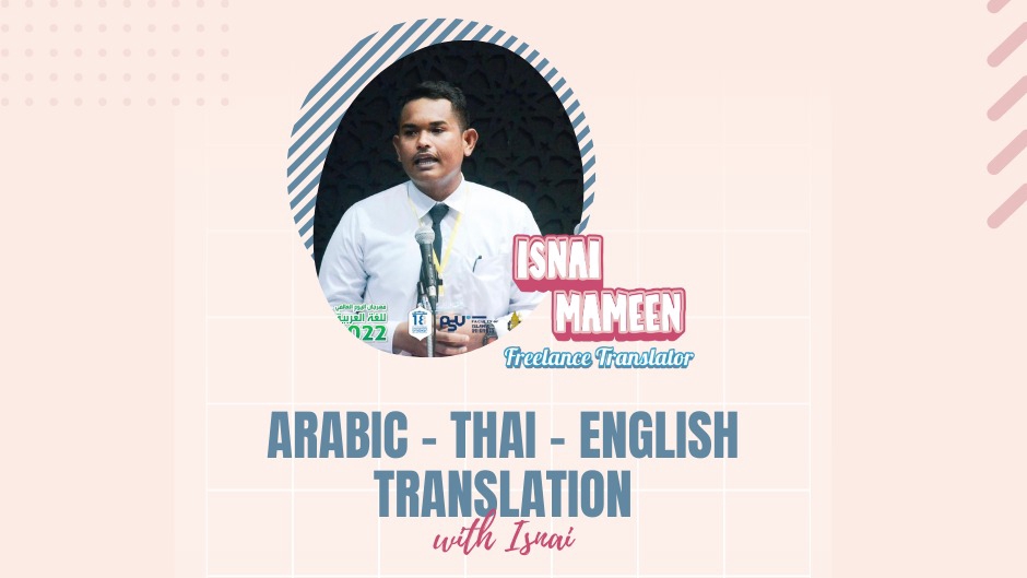 ให้บริการแปลและล่ามภาษา ไทย – อาหรับ – อังกฤษ ทั้งงานธุรกิจ การศึกษา และงานทั่วไป ถ่ายทอดความหมายได้ถูกต้อง เข้าใจง่าย และเหมาะสมกับวัฒนธรรมของคู่สื่อสาร ประสบการณ์ - ใช้ภาษาได้อย่างคล่องแคล่ว (Thai – Native, English C1 TOEIC 900, Arabic Advanced) - มีประสบการณ์ล่ามในโรงพยาบาล งานแข่งขันโต้วาที และโครงการแลกเปลี่ยนต่างประเทศ - เข้าใจทั้งภาษาและวัฒนธรรม ทำให้การสื่อสารลื่นไหล