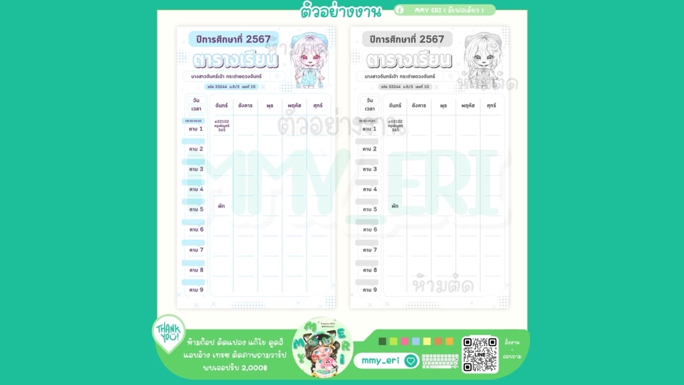 รับทำป้ายตารางเรียน ตารางสอน มีตัวการ์ตูนให้เลือก มีแบบให้เลือก รองานไม่เกิน1-3วัน บรีฟงานเพิ่มเติมได้ ใส่รายละเอียดในตารางให้ทั้งหมด ส่งไฟล์งานทาง drive ไฟล์ jpg ขั้นตอนการทำงาน 1. แจ้งรายละเอียดงาน 2. ดำเนินงาน ตรวจงาน 3. โอนเงินและรอรับไฟล์งาน