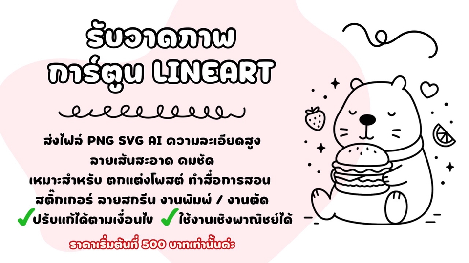 งานวาดตัวละครหรือภาพประกอบแบบ เส้นลายเส้น (Outline / Line Art) ไม่มีการลงสี เน้นเส้นสะอาด คมชัด สไตล์การ์ตูน/คาแรคเตอร์ตามเอกลักษณ์ของร้าน เหมาะสำหรับนำไปใช้เป็นแม่แบบ งานพิมพ์ งานเลเซอร์ งานสติ๊กเกอร์ หรือการนำไปลงสีต่อเอง ขอบเขตงานที่ได้รับ • วาดตัวละคร 1 ตัว / 1 ภาพ (ท่าทางเดียว) • เส้นสีเดียว (ไม่มีไล่สี / เงา / แสง) • ความหนาเส้นสม่ำเสมอ เหมาะสำหรับงานพิมพ์และตัด • ปรับแก้ได้ 2 ครั้งต่อภาพ (ภายในขอบเขตเดิม) • สามารถระบุท่าทาง อารมณ์ เสื้อผ้า หรือธีมได้ ไฟล์ที่ได้รับ • PNG พื้นหลังโปร่งใส • AI / SVG (กรณีต้องการไฟล์เวกเตอร์ สำหรับแม่พิมพ์หรือการผลิต) การใช้งาน • ราคามาตรฐานเป็น การใช้งานส่วนตัว (Personal Use) • ยังไม่รวมการใช้งานเชิงพาณิชย์ งานผลิต หรือจำหน่ายสินค้า • หากนำไปใช้เชิงพาณิชย์ จะมีค่าลิขสิทธิ์เพิ่มเติมตามประเภทการใช้งาน ระยะเวลาการทำงาน • ประมาณ 1–3 วัน / ภาพ (ขึ้นอยู่กับรายละเอียดและคิวงาน)