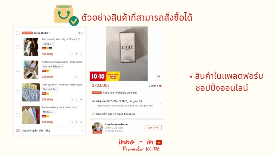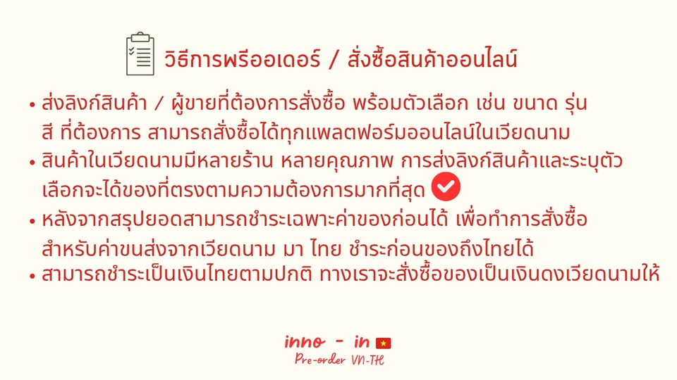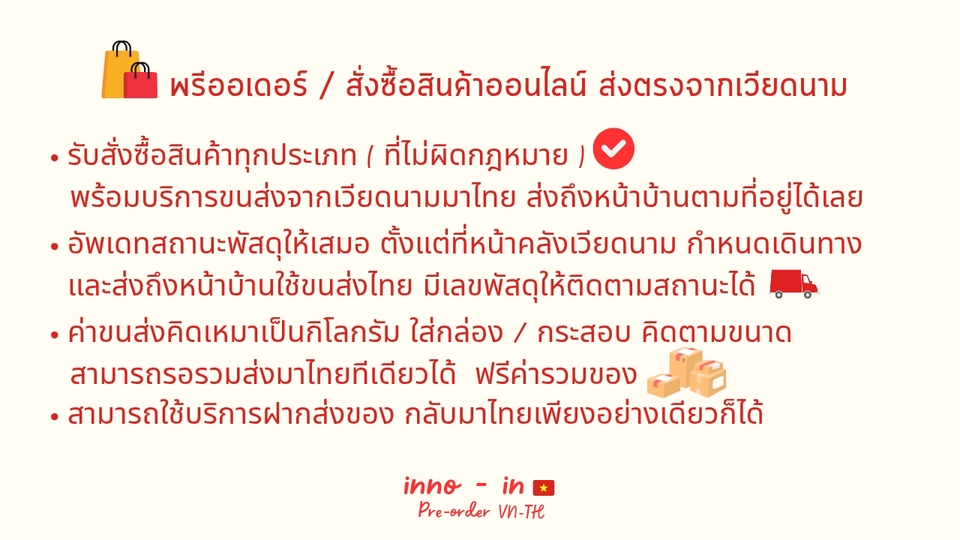 ✨ บริการของเรา : สั่งซื้อสินค้าจากเวียดนามส่งมาไทย ทางเรารับพรีออเดอร์สินค้าทุกประเภทจากประเทศเวียดนาม 🇻🇳 ไม่ว่าจะเป็นสินค้าแฟชั่น สินค้าอุปโภคบริโภค มีหน้าคลังเวียดนามรับของ มั่นใจได้ว่าจะได้รับสินค้าในราคาขนส่งที่คุ้มค่า และส่งถึงหน้าบ้านโดยขนส่งไทย 🇹🇭 ✅ จุดเด่นที่ทำให้เราแตกต่าง * ทีมงานคนเวียดนามแท้ ๆ : มีทีมงาน หน้าคลังเวียดนาม เป็นคนเวียดนาม สั่งซื้อ / สื่อสารกับผู้ขายเวียดนามโดยตรง * คลังสินค้าเวียดนามส่วนตัว : จัดการสินค้าอย่างเป็นระบบ แจ้งสถานะของทุกครั้ง ก่อนการจัดส่งระหว่างประเทศ * ขนส่งจากเวียดนาม มา ไทย มีเวลากำหนดแน่นอน สามารถวางแผนการใช้สินค้าได้ง่ายขึ้น 📦 ขั้นตอนการให้บริการ * แจ้งรายการสินค้า : ผู้ว่าจ้างส่งรายละเอียดสินค้า (Link/รูปภาพ/ข้อมูลร้านค้า) ที่ต้องการพรีออเดอร์ * ตรวจสอบและเสนอราคา : ทางเราจะดำเนินการตรวจสอบความพร้อมของสินค้า และสรุปยอดค่าใช้จ่ายพร้อมส่งใบเสนอราคา (Quotation) * ยืนยันการสั่งซื้อ: ผู้ว่าจ้างชำระเงินตามใบเสนอราคา จากนั้นเราจะเริ่มดำเนินการสั่งซื้อทันที 🛍️ จัดการที่คลังเวียดนาม หลังการสั่งซื้อ เมื่อหน้าคลังเวียดนามได้รับสินค้า จะแจ้งอัพเดทสถานะกับผู้ว่าจ้าง * สามารถดำเนินการแพ็คกิ้งเพิ่มเติมได้ * ขนส่งจากเวียดนาม มา ไทยทางรถยนต์ เมื่อสินค้าถึงคลังไทย ขนส่งไทยจะดำเนินการจัดส่งถึงมือผู้ว่าจ้างตามที่อยู่ที่กำหนด ( ค่าบริการขนส่งในไทย ชำระจริงตามบิล ไม่บวกเพิ่ม ) 💰 ค่าบริการขนส่งและพรีออเดอร์ มี 4 ส่วน ⭐ค่าสินค้า รวมขนส่งมาที่หน้าคลังเวียดนาม ⭐ค่าบริการสั่งซื้อ ค่าบริการสั่งซื้อ 100 บาท / 1 รอบการสั่งซื้อ สั่งซื้อ 5 ผู้ขายขึ้นไป 150 บาท ⭐ค่าขนส่งจากเวียดนามมาไทย คิดเหมาเป็นกิโลกรัม | 1 - 2 kg | คิดเหมา 590 ฿ | 2.1 - 5 kg | กิโลกรัมละ 200 ฿/kg | 5.1 - 9.9 kg | กิโลกรัมละ 150 ฿/kg | 10 kg ขึ้นไป | กิโลกรัมละ 119 ฿ /kg ⭐ ค่าขนส่งจากคลังไทย ถึง หน้าบ้านตามที่ระบุ จ่ายตามบิลของขนส่งไทย (หมายเหตุ: Fastwork จะหักค่าธรรมเนียม [15%] จากยอดรวม ก่อนโอนให้ฟรีแลนซ์) 📌 ทักแชทเพื่อสอบถามรายละเอียดเพิ่มเติมได้เลยค่ะ