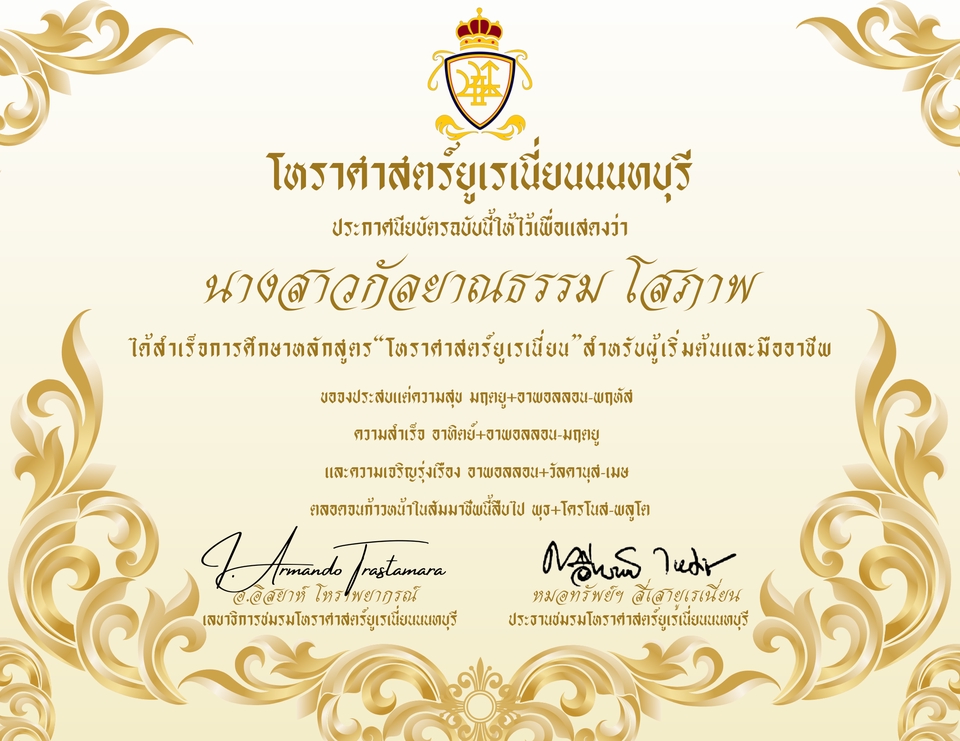 ฿39,999-ใช้เวลาเรียน ชั่วโมงเรียน 30-50 ชั่วโมง -เรียนจบจะได้รับการทดสอบ - เมื่อสอบผ่านจะได้รับ 1.ใบประกาศนียบัตรจากชมรมโหราศาสตร์นนทบุรี 2.หนังสือ "สูตรจุดอิทธิพล" 3.สถานภาพสมาชิกชมรมโหราศาสตร์นนทบุรีแบบถาวร