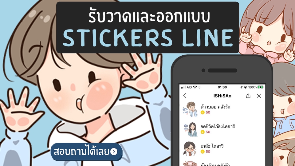 ---- >> ยังไม่รับสติ๊กเกอร์ไลน์แบบเคลื่อนไหวได้ << ----- วาดจากโปรเเกรม Sai และ AdobePhotoshop ถนัดการ์ตูนแนวSD(Chibi) ***หากถูกทางไลน์ Reject มา ทางเราแก้ให้ฟรีจนกว่าจะผ่าน*** (ราคาอาจเปลี่ยนแปลงหากมีรายละเอียดอื่น ๆ เพิ่มเติม เช่น เพิ่มตัวละคร/เสื้อผ้า) ระยะเวลาการทำงานขึ้นอยู่กับงานในคิว สิ่งที่จะได้รับ คือ - ไฟล์ Zip ที่สามารถอัฟขึ้น Line ได้ทั้งหมดให้ทีเดียว ซึ่งภายในจะประกอบด้วย (ไฟล์ภาพ PNG ตามจำนวนสติีกเกอร์ไลน์ที่สั่งทำ) ** อนุญาตให้นำไฟล์ไปใช้อย่างอื่นเพิ่มเติมได้ เช่น ในเพจ วีดีโอ ฯลฯ ** แต่ภาพอาจจะเล็กเพราะมีขนาดอยู่ที่ 370 x 320 (เป็นขนาดในการอัฟ Sticker Line) กรณีอยากได้ภาพที่ใหญ่ขึ้น หรือ ต้องการไฟล์ที่แก้ไขอะไรเพิ่มเติมได้เอง - ทางเราจะมีไฟล์ PSD ให้ด้วย ซึ่งจะมีค่าใช้จ่ายเพิ่มเติม ขั้นตอนการทำงาน 1. ตกลงเรื่องคาเรคเตอร์ตัวละคร (วาดตัวอย่างให้ดู) 2. บรีพคำพูดและท่าทางของตัวละครทั้งหมด 3. วาดภาพร่างทั้งหมด (ส่งงานให้ลูกค้าดู เผื่อแก้ไขท่าทาง) 4. ตัดเส้น-ลงสี- ใส่ฟอนต์ (ส่งภาพผลงานทั้งหมดในลูกค้าเช็คครั้งสุดท้ายก่อนส่งงาน)