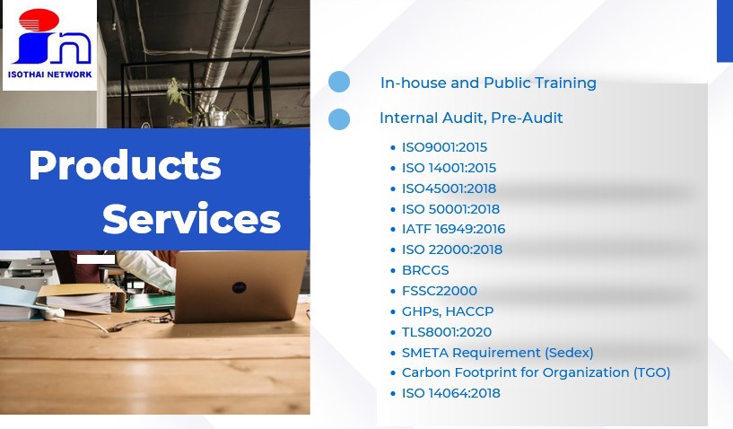 ผู้เชี่ยวชาญด้านให้บริการด้านการให้คำปรึกษา ฝึกอบรม และตรวจประเมินระบบบริหารจัดการที่หลากหลายแก่ภาคธุรกิจในประเทศไทย ด้วยความมุ่งมั่นที่จะผลักดันมาตรฐานองค์กรสู่ระดับสากล เช่น ISO 9001/14001/45001/22000/14064/13485/50001/BRC/FSSC/Global G.A.P./ISCC/CFO/CFP/SA8000 ขั้นตอนการทำงาน 1. แจ้งบริการที่ ลูกค้าต้องการ ว่าเป็น อบรม ที่ปรึกษา ตรวจรับรอง ตรวจประเมินผู้ขาย หรืออื่นๆ 2. ประเมินราคาและความต้องการลูกค้า 3. กำหนดแผนการทำงาน ระยะเวลาการทำงาน และเงื่อนไขการส่งมอบงาน 4. การกำหนดเงื่อนไขการชำระเงิน