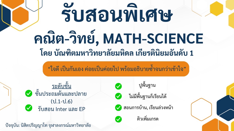 ปัจจุบันนิสิตปริญญาโท จุฬาลงกรณ์มหาวิทยาลัย และบัณฑิตมหาวิทยาลัยมหิดล เกียรตินิยมอันดับ 1 (ป.ตรี) คะแนนสูงสุดในชั้นปีในการนำเสนอและเขียนโครงร่างงานวิจัย (Proposal)