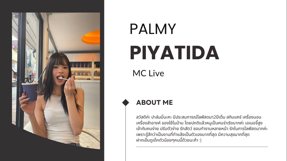 สวัสดีค่า ปาล์มมี่นะคะ ปัจจุบันเป็นฟรีแลนซ์ไลฟ์สด