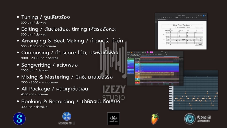 IZEZY STUDIO บริการห้องซ้อมดนตรี / ห้องอัดเสียง / รับทำเพลง -Editing 300 บาท / ต่อเพลง -Tuning 300 บาท / ต่อเพลง -Arranging & Beat Making 500 - 1500 บาท / ต่อเพลง -Mixing & Mastering 1500 - 3000 บาท / ต่อเพลง -Songwriting 2000 บาท / ต่อเพลง -Score Composing 1000 - 2000 บาท / ต่อเพลง -All Package / ผลิตทุกขั้นตอน 4500 บาท / ต่อเพลง