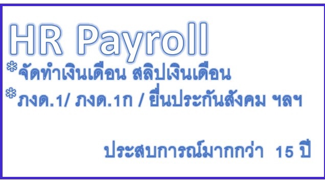 1. คำนวณเงินเดือนพนักงาน ค่าล่วงเวลา โบนัส รายได้ต่าง ๆ และรายจ่ายอื่น ๆ เช่น ประกันสังคม ภาษี ฯลฯ รวมทั้งจัดทำสลิปเงินเดือนให้พนักงาน 2. ยื่นประกันสังคมและ ภาษี (ภงด.1) ในแต่ละเดือน 3. ราคานี้ สำหรับพนักงาน 1-20 คน หากเกินกว่านั้น ให้คุยอีกครั้ง ขั้นตอนการทำงาน 1. ทำเงินเดือน รายได้ รายหัก ภาษี ประกันสังคม ให้เรียบร้อย รวมทั้งทำสลิปเงินเดือน 2. ส่งให้ลูกค้า approve แก้ไขไม่เกิน 1 ครั้ง 3. ยื่นข้อมูล ประกันสังคม แต่ละเดือน ทางอินเตอร์เนต 4. ยื่นข้อมูล ภงด.1 แต่ละเดือน ทางอินเตอร์เนต