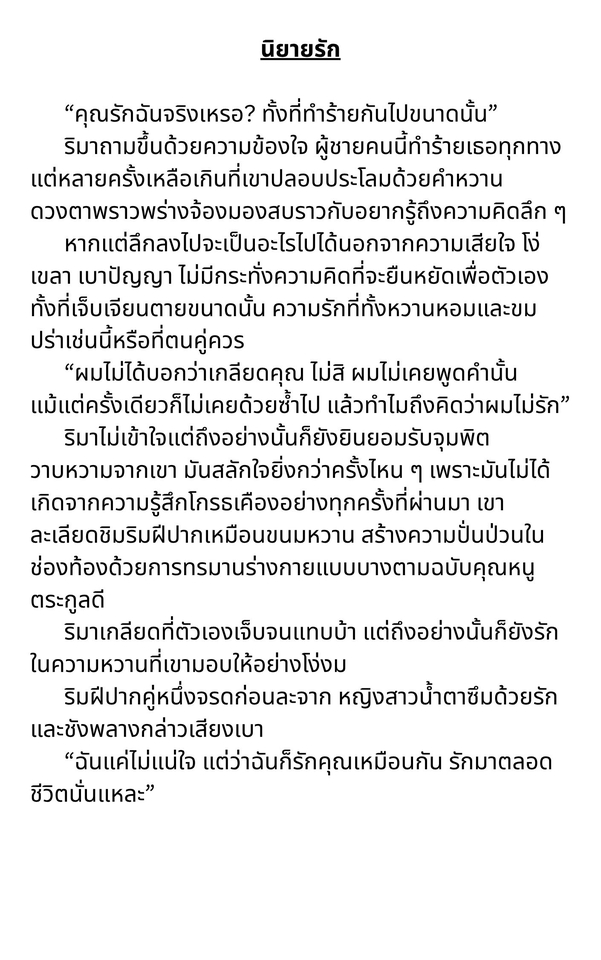 Ghost Writer เขียนนิยาย / เรื่องสั้น / งานตามสั่งเกี่ยวกับวรรณกรรมทุกประเภท BY เจิมจันทร์ ศีกร แนวงานที่รับทำ นิยายจีนโบราณ นิยายรักโรแมนติก นิยายแฟนตาซี นิยายวาย / ยูริ นิยายผู้ใหญ่ PWP แฟนฟิคชั่น เรื่องสั้น บทละคร บทพูดการ์ตูน บทพูดเพื่อนิยายเสียง นิทานเพื่อนำไปลงใน YouTube โดยปกติเขียนได้ทั้งแนวการดำเนินเรื่องปกติ โอเมก้าเวิร์ส mpreg หรือโลกรูปแบบอื่น ๆ ทางผู้ว่าจ้างสามารถแจ้งและอธิบายรูปแบบที่ต้องการภายในโลกนั้น ๆ ได้ แนวแฟนตาซี เวทมนตร์ โลกใหม่ (ในส่วนนี้หากมีส่วนไหนต้องการเพิ่มไปเป็นพิเศษสามารถแจ้งเพิ่มเติมได้ค่ะ) ***ไม่รับงานแนวผิดศีลธรรม - นอกกายนอกใจ อัตราค่าบริการ Short NC เฉพาะเขียน NC ขั้นต่ำ 3,000 คำ / บิล ราคา 600 บาท เรทราคา 1,000 คำ / 180 บาท เกินกว่ากำหนดตกลงคิดเรทราคา 1,000 คำ / 159 บาท ขั้นตอนการทำงาน 1. พูดคุยทำความเข้าใจเนื้อหาผ่านข้อความของทาง Fastwork เพื่อให้รับทราบข้อตกลงและเงื่อนไขตามสัญญาซึ่งทางร้านจะมีให้ 2. พิมพ์รับทราบหลังจากรับทราบเงื่อนไข จากนั้นฟรีแลนซ์สร้างใบเสนอราคา ลูกค้าชำระเงินตามระบบ โดยในส่วนนี้จะมีการตรวจสอบข้อมูล ประเมินจำนวนหน้าและจำนวนคำคร่าว ๆ เพื่อให้ผู้ว่าจ้างสามารถประเมินได้ว่าตัวงานจะออกมาประมาณไหน 3. เมื่อขั้นตอนด้านบนเสร็จเรียบร้อย ฟรีแลนซ์จะเริ่มทำงานตามระยะเวลาที่ระบุในสัญญา โดยตัวงานจะส่งผ่าน Fastwork เท่านั้น งดสนทนากับฟรีแลนซ์หรือเพิ่มรายละเอียดระหว่างการทำงานเพราะจะเป็นการทำให้งานล่าช้ากว่าที่กำหนดเอาไว้ ดังนั้นหากมีการพูดคุยเกิดขึ้น ผู้ว่าจ้างต้องยอมรับถึงความล่าช้าซึ่งอาจเกิดขึ้นได้ในกรณีนี้ 4. เมื่องานเสร็จเรียบร้อยจะมีการส่งให้เพื่อตรวจสอบ (มีลายน้ำ) โดยหากว่าหลังส่งตรวจรับงานภายใน 24 ชั่วโมงแล้วยังไม่มีการตอบกลับ ทางเราจะถือว่าลูกค้ายอมรับงานโดยปริยาย 5. เมื่อพ้น 24 ชั่วโมงที่ผู้ว่าจ้างไร้การติดต่อใด ๆ กลับมา (สืบเนื่องจากข้อที่ 4 ) ทางเราจะส่งไฟล์ไฟนอล word และ pdf ให้ทันที 6. ลูกค้าอนุมัติงานและเขียนรีวิวฟรีแลนซ์ หมายเหตุ ลิขสิทธิ์เป็นของผู้จ้างทันทีที่จบงานสามารถทักมาถามรายละเอียดเพิ่มเติมได้