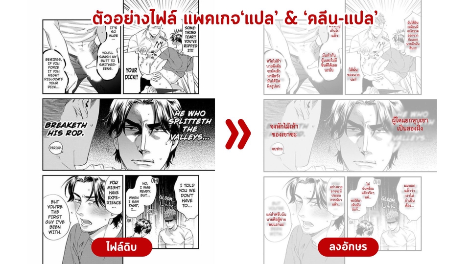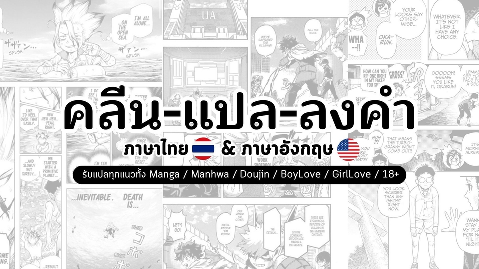 รับคลีน-แปล-ลงคำจาก 'English' เป็น 'ภาษาไทย' รับงาน Manga/Manhwa ทุกแนวไม่ว่าจะเป็น Action, Slice Of Life, Sport, Adventure, Boy Love, Girl Love, 18+ และอื่น ๆ 🪄ฟรีแลนซ์สามารถใช้งาน Photoshop และ Procreate ได้อย่างชำนาญพร้อมประสบการณ์แปลมังงะมามากว่า 200+ หน้า วิธีการ ‘บรีฟ/ชี้แจ้งเนื้องาน’ เพื่อความเข้าใจที่ตรงกันอย่างรวดเร็ว: 🖋️ระบุแนว Manga/Manhwa 🖋️ระบุจำนวนหน้า หรือ จำนวนคำโดยประมาณ 🖋️ระบุฟอนต์หลักที่ต้องการ (หากไม่มีในเบื้องต้นจะใช้ THSarabunPSK และอื่น ๆ ตามความเหมาะสม) ลำดับการทำงาน: 1. คุณลูกค้า‘ชี้แจงเนื้องาน’พร้อม‘ส่งไฟล์ผ่านลิงค์ Google Drive’ 2. ฟรีแลนซ์ตอบกลับ+ส่งข้อมูล‘การประเมินราคา’และ‘ระยะเวลาการทำงาน’ *โดยทั่วไปแล้วจะไม่เกิน 1-5 วันนับจากวันที่ชำระเงินขั้นอยู่กับเนื้องาน* 3. คุณลูกค้าปรับแต่ง/ยอมรับข้อตกลง และ ชำระเงิน 4. ฟรีแลนซ์เริ่มทำงานและแก้ไขตามข้อตกลง 5. ส่งไฟล์งาน Final (PDF, JPEG.) ✅คุณลูกค้าสามารถแก้ไขงานได้ไม่เกิน 2 รอบโดยไม่มีค่าใช้จ่ายใด ๆ เพิ่มเติม ✅ ขั้นตอนการทำงาน 1. คุณลูกค้า‘ชี้แจงเนื้องาน’พร้อม‘ไฟล์เนื้อหา’ 2. ฟรีแลนซ์ตอบกลับ+ส่งข้อมูล‘การประเมินราคา’และ‘ระยะเวลาการทำงาน’ *โดยทั่วไปแล้วจะไม่เกิน 1-5 วันนับจากวันที่ชำระเงินขั้นอยู่กับเนื้องาน* 3. คุณลูกค้าปรับแต่ง/ยอมรับข้อตกลง และ ชำระเงิน 4. ฟรีแลนซ์เริ่มทำงานและแก้ไขตามข้อตกลง 5. ส่งไฟล์งาน Final (PDF, JPEG.)