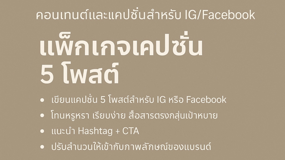 ฿1,200– เขียนแคปชั่น 5 โพสต์สำหรับ IG หรือ Facebook – โทนหรูหรา เรียบง่าย สื่อสารตรงกลุ่มเป้าหมาย – แนะนำ Hashtag + CTA – ปรับสำนวนให้เข้ากับภาพลักษณ์ของแบรนด์