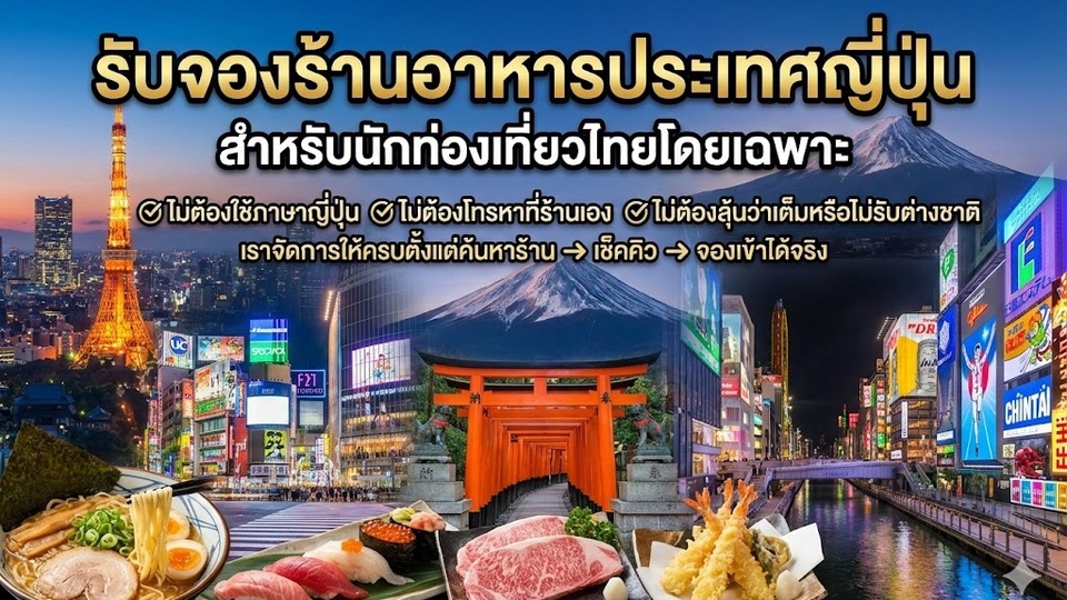บริการ “ผู้ช่วยจองร้านอาหารในญี่ปุ่น” สำหรับนักท่องเที่ยวไทยโดยเฉพาะ • ไม่ต้องใช้ภาษาญี่ปุ่น • ไม่ต้องโทรหาที่ร้านเอง • ไม่ต้องลุ้นว่าเต็มหรือไม่รับต่างชาติ เราจัดการให้ครบตั้งแต่ค้นหาร้าน → เช็คคิว → จองเข้าได้จริง