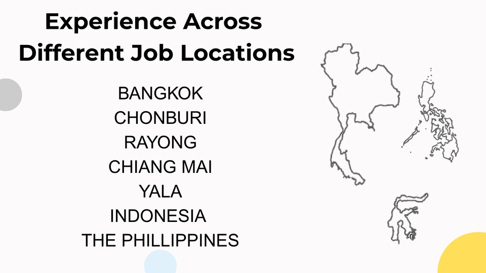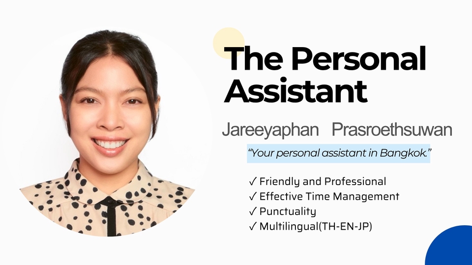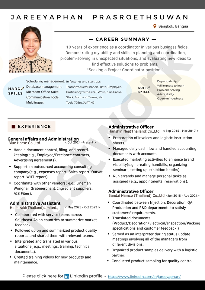 Efficient at multitasking Support in different languages (Japanese/Thai/English) Flexible working hours Open minded Love plants and animals