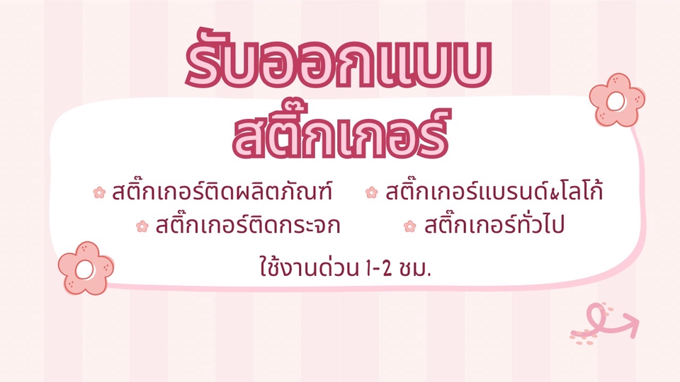 ออกแบบสติ๊กเกอร์จากความชอบของตัวเองและฝึกฝนพัฒนามาตลอด4ปีสติ๊กเกอร์ร้านค้าออนไลน์ของตัวเองแหละออกแบบตามความต้องการของลูกค้าทั่วไปเช่นสติ๊กเกอร์ติดขวดน้ำ กล่องอาหาร กล่องพัสดุ และผลิตภัณฑ์อื่นๆตามที่ลูกค้าบีฟได้เลยค่ะ ขั้นตอนการทำงาน 1. ลูกค้าแจ้งบรีฟที่ลูกค้าต้องการให้ออกแบบ 2. ลูกค้าเลือกแพ็คเกจที่เหมาะสม และชำระเงิน 3. เริ่มดำเนินการออกแบบและจัดส่งตามเวลาที่กำหนด 4. ลูกค้าสามารถเลือกแบบข้างต้นได้1แบบ สามารถแจ้งแก้ไขเพิ่มเติมได้(ภายใต้จำนวนครั้งที่กำหนด) 5. เมื่อได้แบบที่ลูกค้าพอใจแล้ว ลูกค้าสามารถคอนเฟิร์มแบบเพื่อส่งเป็นไฟล์งานต้นฉบับให้ค่ะ