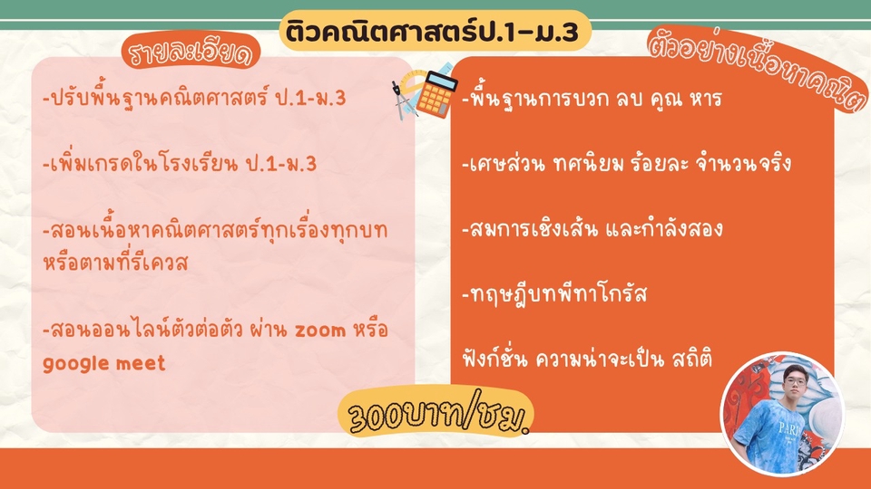 ติวคณิตศาสตร์ตั้งแต่ป.1ถึงม.3 ติวเพิ่มเกรดในโรงเรียน หรือติวเพื่อสอบ เข้าใจง่าย มีเทคนิคให้นำไปใช้ได้ แค่300บาทต่อชั่วโมง สามารถเรียนกี่ครั้งก็ได้ ไม่เข้าใจสอบถามได้ มีเอกสารให้ใช้ติวพร้อม เรียนไม่เครียดแน่นอนเพราะพี่เป็นคนชิลๆ