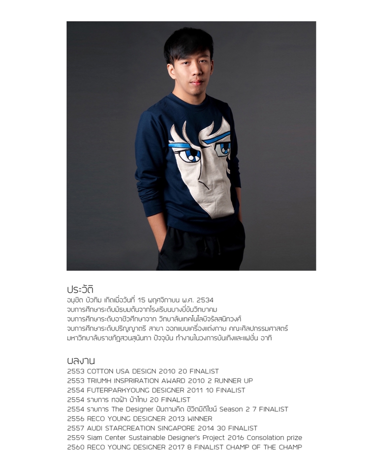 อนุชิต บัวทิม ____________________________________ THIS ORGANIZE 🖍ADVERTISING รับถ่ายโฆษณา M/V FASHION VIDEO FASHON SET 🖍CHEERLEADER สอนเชียร์ลีดเดอร์ เสิ้อผ้า แต่งหน้า ทำผม ออกแบบฉาก และอุปกรณ์ 🖍รับสร้างแบรนด์แฟชั่น ออกแบบ ผลิต ถ่าย LOOKBOOK 🖍COSTUME ออกแบบชุดสำหรับการแสดง ทุกประเภท เต้น รำ ฯลฯ 🖍MARCHING BAND ออกแบบโชว์ และ ฝึกสอน วงโยธวาทิต COLOR GUARD 🖍BAND ออกแบบโชว์ และ ฝึกสอน วงดนตรีลูกทุ่ง เสิ้อผ้า แต่งหน้า ทำผม ออกแบบฉาก และอุปกรณ์ โดยทีมงานมืออาชีพ จากวงการบันเทิงและการแสดง 🖍EVENT Product launch event จัดงานเปิดตัวสินค้าทุกประเภท Fashion show event จัดแฟชั่นโชว์ แฟชั่นโชว์ THESIS รายละเอียดราคาเพิ่มเติม ประวัติ อนุชิต บัวทิม เกิดเมื่อวันที่ 15 พฤศจิกายน พ.ศ. 2534 จบการศึกษาระดับมัธยมต้นจากโรงเรียนบางยี่ขันวิทยาคม จบการศึกษาระดับอาชีวศึกษาจาก วิทยาลัยเทคโนโลยีจรัลสนิทวงศ์ จบการศึกษาระดับปริญญาตรี สาขา ออกแบบเครื่องแต่งกาย คณะศิลปกรรมศาสตร์ มหาวิทยาลัยราชภัฏสวนสุนันทา ปัจจุบัน ทำงานในวงการบันเทิงและแฟชั่น อาทิ ผลงาน 2553 COTTON USA DESIGN 2010 20 FINALIST 2553 TRIUMH INSPRIRATION AWARD 2010 2 RUNNER UP 2554 FUTERPARKYOUNG DESIGNER 2011 10 FINALIST 2554 รายการ ทอฟ้า ผ้าไทย 20 FINALIST 2554 รายการ The Designer ฝันตามคิด ชีวิตมีดีไซน์ Season 2 7 FINALIST 2556 RECO YOUNG DESIGNER 2013 WINNER 2557 AUDI STARCREATION SINGAPORE 2014 30 FINALIST 2559 Siam Center Sustainable Designer's Project 2016 Consolation prize 2560 RECO YOUNG DESIGNER 2017 8 FINALIST CHAMP OF THE CHAMP