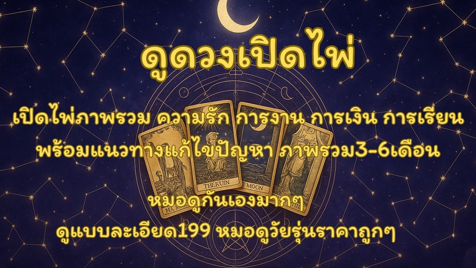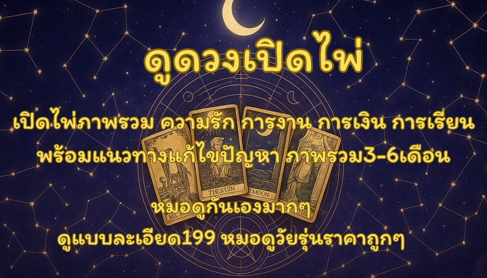 ดูดวงเปิดไพ่199ดูละเอียด เรื่องความรัก การงาน การเงินการเรียน และปัญหาด้านอื่นๆ 1คำถาม19บาท แต่ไม่มีแนงทางแก้ไขให้ 199บาท มีแนวทางแก้ไขให้พร้อมดูภาพรวม3-6เดือน ขั้นตอนการทำงาน 1. แจ้งชื่อเล่นพร้อมอายุ 2. เรื่องที่จะดู 3. ทางหมอจะติดต่อกลับไปแจ้งคิว 4. ทำการดูดวง 5. จ่ายเงิน