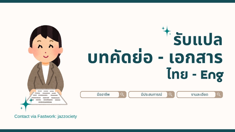 รับแปลงานที่เกี่ยวข้องกับภาษาอังกฤษ จากไทยเป็นอังกฤษ หรือ อังกฤษเป็นไทย ด้วยคุณวุฒิศิลปศาสตร์บัณฑิต สาขาวิชาภาษาอังกฤษ มีประสบการณ์แปลงาน เช่น บทคัดย่อ, งานวิจัย และประสบการณ์เป็นอาจารย์สอนภาษาอังกฤษเป็นเวลา 10ปี ขั้นตอนการทำงาน 1. ลูกค้าแจ้งรูปแบบ/แพคเกจงานที่ต้องการจ้าง 2. ลูกค้าส่งไฟล์เนื้อหาของงานที่ต้องการให้แปล/คิดคำ 3. คำนวณจำนวนคำเพื่อประเมินราคา และแจ้งราคากับลูกค้า 4. ตกลงดำเนินงาน แจ้งระยะเวลาการทำงาน 5. ส่งมอบงานให้ลูกค้า