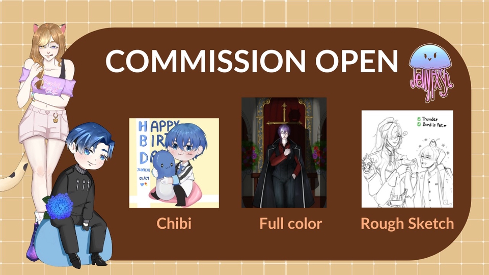 รับวาดภาพแฟนอาร์ต อนิเมะ original character Chibi ต่างๆในสไตล์เส้นที่ออกไปในแบบของเอเชีย ถ้าคุณชอบเชิญมาทางนี้ได้เลยค่ะ -สามารถสอบถามรายละเอียด หรือขอดูรูปเพิ่มเติมได้ค่ะ- -เวลาของงานอยู่ในช่วง 3-5 วันไม่เกินนี้ หากล่าช้าจะแจ้งให้ทราบค่ะ -หากเป็นเชิงพาณิชย์ ขออนุญาตคูณ 3 นะคะ- ขั้นตอนการทำงาน 1. บรีฟงาน โดยสิ่งที่ต้องแจ้งมีรายละเอียดตัวละคร ท่าทาง และวัตถุประสงค์ เพื่อที่จะได้จัดการปรับขนาดcanvas ให้เหมาะสม 2. คุยตกลงราคาและรายละเอียดต่างๆ 3. เริ่มทำงาน โดยจะส่งให้ตรวจงาน 3 ครั้ง คือ Sketch/Base color/งานที่เสร็จสมบูรณ์ 4. แก้งานตามความพอใจของลูกค้า ได้แค่ 2 ครั้ง มากกว่านี้มีคิดค่าบริการเพิ่มค่ะ 5. เมื่อได้งานที่พอใจจะส่งงาน และถือว่าเป็นการจบงาน