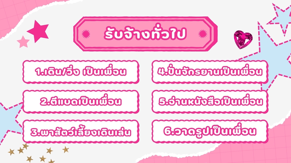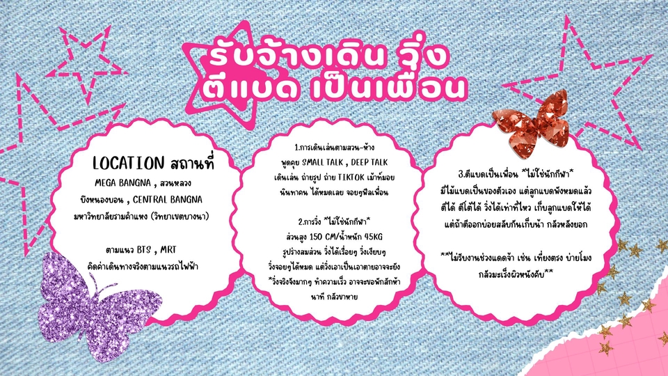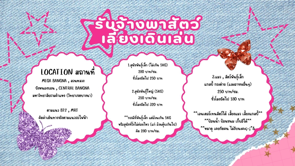 ☆ ข้อมูลคร่าวๆกดเลื่อนดูรูปภาพได้ค่ะ ⭐️ 🏃🏼ออกกำลังกาย เดิน วิ่ง ตีแบด วาดรูป อ่านหนังสือ พูดคุย เม้าท์มอย 180 บาท/ชม. ชั่วโมงถัดไป 150 บาท 🤙🏾 Introvert ไม่ต้องกลัวเรา เราก็ Introvert เหมือนกัน ;-; 🫂 พี่ๆ Extrovert ไม่ต้องกลัวเหงา ถ้าพี่เริ่มคุยก่อน หนูก็ขี้เม้าท์ระดับนึง ————— 🐕🦺 พาสัตว์เลี้ยงเดินเล่น 1.สุนัขพันธุ์เล็ก (ไม่เกิน 5kg) 280 บาท/ชม. ชั่วโมงถัดไป 250 บาท 2.สุนัขพันธุ์ใหญ่ (5kgขึ้นไป) 350 บาท/ชม. ชั่วโมงถัดไป 320 บาท **กรณีที่พันธุ์เล็ก แต่อ้วนเกิน 5kg หรือสุนัขที่วิ่งไม่ค่อยไหว (แก่ อ้วนตุ้บเกินไป) คิด 280 บาท/ชม. 3.แมว , สัตว์พันธุ์เล็ก แกสบี้ กระต่าย (และอาจจะอื่นๆ) 250 บาท/ชม. ชั่วโมงถัดไป 180 บาท *เอนเตอร์เทนสัตว์ได้ เลี้ยงแมว เลี้ยงแกสบี้ *ป้อนน้ำ ป้อนขนม เก็บอึได้ *หมาดุ เคยกัดคน ไม่รับนะคะ;-; Location — สถานที่ Mega Bangna , สวนหลวง บึงหนองบอน , Central Bangna มหาวิทยาลัยรามคำแหง (วิทยาเขตบางนา) ตามแนว BTS , MRT คิดค่าเดินทางจริงตามแนวรถไฟฟ้า มหาวิทยาลัยรามคำแหง (หัวหมาก) คิดค่าเดินทาง +50 บาท