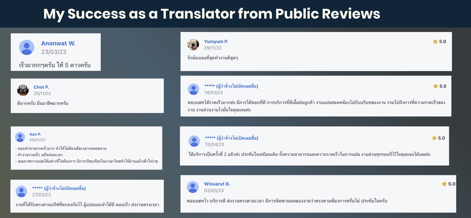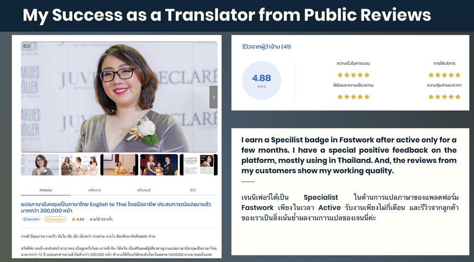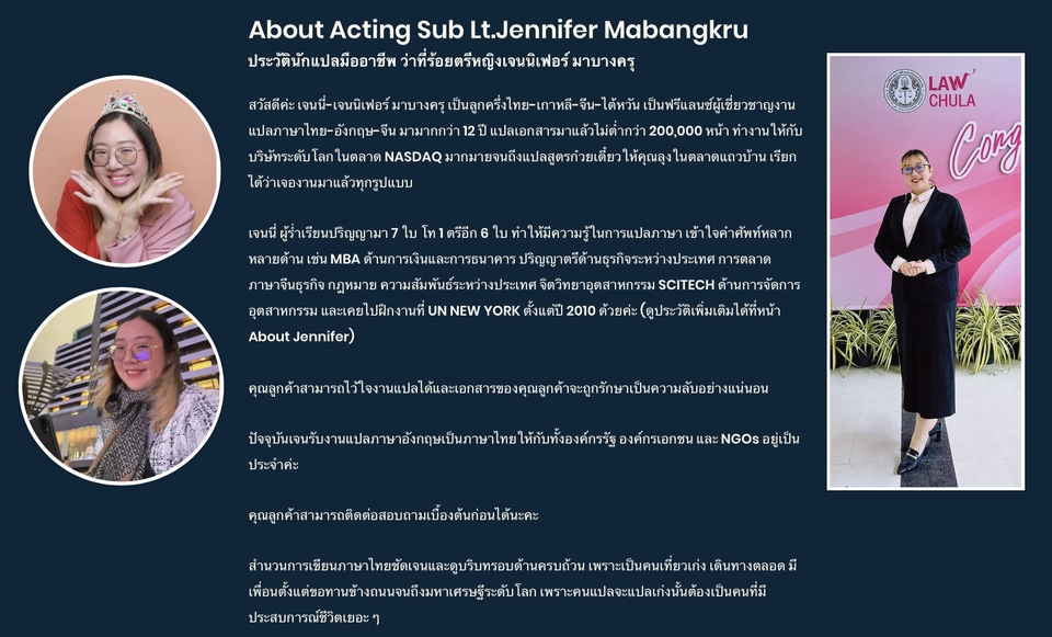 แปลรายงานประจำปี 56-1 One Report กว่า 100 บริษัท เราคือเบื้องหลังความน่าเชื่อถือของคุณ ^^ สวัสดีค่ะ เจนนี่-เจนนิเฟอร์ มาบางครุ เป็นลูกครึ่งไทย-เกาหลี-จีน-ไต้หวัน เป็นฟรีแลนซ์ผู้เชี่ยวชาญงานแปลภาษาอังกฤษเป็นภาษาไทย มามากกว่า 12 ปี แปลเอกสารมาแล้วไม่ต่ำกว่า 200,000 หน้า ทำงานให้กับบริษัทระดับโลกในตลาด NASDAQ มากมายจนถึงแปลสูตรก๋วยเตี๋ยวให้คุณลุงในตลาดแถวบ้าน เรียกได้ว่าเจองานมาแล้วทุกรูปแบบ เจนนี่ ผู้ร่ำเรียนปริญญามา 7 ใบ โท 1 ตรีอีก 6 ใบ ทำให้มีความรู้ในการแปลภาษา เข้าใจคำศัพท์หลากหลายด้าน เช่น MBA ด้านการเงินและการธนาคาร ปริญญาตรีด้านธุรกิจระหว่างประเทศ การตลาด ภาษาจีนธุรกิจ กฎหมาย ความสัมพันธ์ระหว่างประเทศ จิตวิทยาอุตสาหกรรม SCITECH ด้านการจัดการอุตสาหกรรม และเคยไปฝึกงานที่ UN NEW YORK ตั้งแต่ปี 2010 ด้วยค่ะ คุณลูกค้าสามารถไว้ใจงานแปลได้และเอกสารของคุณลูกค้าจะถูกรักษาเป็นความลับอย่างแน่นอน ปัจจุบันเจนรับงานแปลภาษาอังกฤษเป็นภาษาไทยให้กับทั้งองค์กรรัฐ องค์กรเอกชน และ NGOs อยู่เป็นประจำค่ะ คุณลูกค้าสามารถติดต่อสอบถามเบื้องต้นก่อนได้นะคะ สำนวนการเขียนภาษาไทยชัดเจนและดูบริบทรอบด้านครบถ้วน เพราะเป็นคนเที่ยวเก่ง เดินทางตลอด มีเพื่อนตั้งแต่ขอทานข้างถนนจนถึงมหาเศรษฐีระดับโลก เพราะคนแปลจะแปลเก่งนั้นต้องเป็นคนที่มีประสบการณ์ชีวิตเยอะ ๆ งานดี มีคุณภาพ รวดเร็ว ทันใจ เป๊ะเว่อร์ค่ะ!!! <3 ขั้นตอนการทำงาน 1. รับเนื้อหาเพื่อประเมินราคางาน และรับทราบกำหนดส่งงานตามที่ลูกค้าต้องการ 2. ประเมินราคางานและแจ้งวันกำหนดส่งงานให้ลูกค้า 3. ส่งงานให้ลูกค้าตรวจสอบตามเวลาที่นัดหมาย 4. ลูกค้าส่งงานตีกลับเพื่อให้แก้ไขได้ 2 ครั้งเฉพาะคำศัพท์บางคำเท่านั้น 5. จบงานอย่างมืออาชีพ แฮปปี้ และรองานใหม่จากลูกค้าอยู่นะคะ ^^