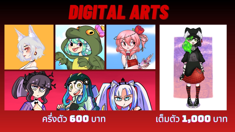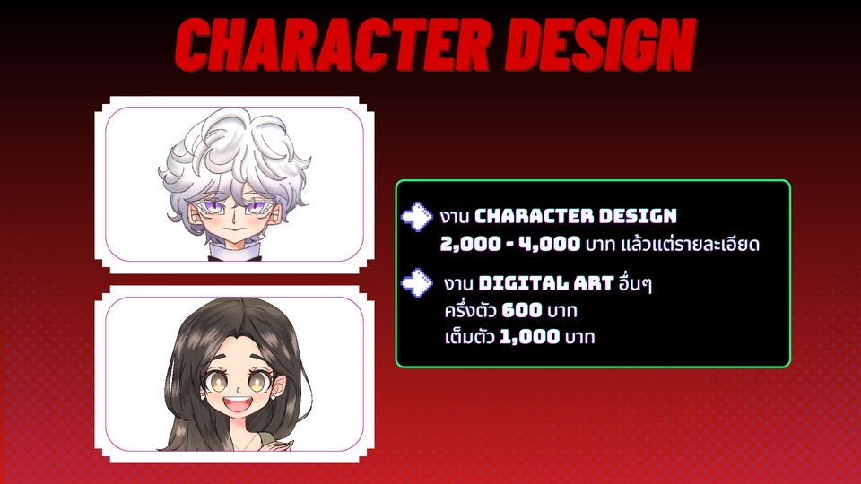รับออกแบบ character design ตัวการ์ตูนน่ารักๆ รับทำ Model Vtuber รับทำ Emote/Badge ให้กับช่องทาง Streaming : TWITCH/YOUTUBE/ETC. รับวาดภาพตัวละคร Scale ต่างๆ รับทำ Sticker line น่ารักๆ ราคาเหมาะสมคุยง่าย งานดี