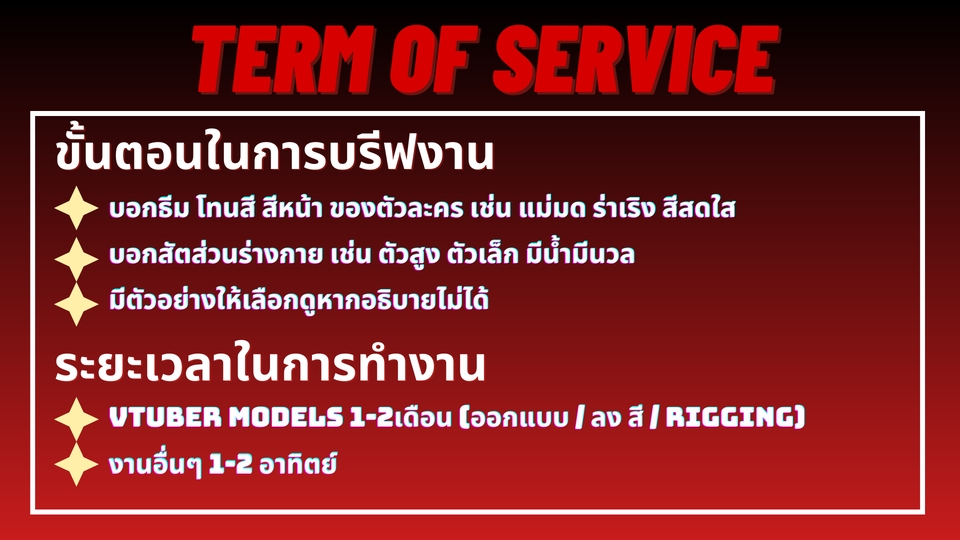 รับออกแบบตัวละครและโมเดล Vtuber (character design)/ภาพการ์ตูน/Fanart/Emote/Badge สำหรับใช้ประกอบในงานดิจิทัลและสื่อสิ่งพิมพ์ต่าง ๆ ด้วยลายเส้นที่มีเอกลักษณ์ตามสไตล์ผู้วาด ใช้โปรแกรม Adobe Photoshop และ Procreate on ipad เป็นหลัก ขั้นตอนการทำงาน 1. บรีฟรายละเอียดงานที่ลูกค้าต้องการอย่างชัดเจน 2. สเก็ตภาพงานให้ลูกค้าเลือกดูเมื่อลูกค้าโอเคกับภาพสเก็ตจะเก็บค่ามัดจำ 50% ของราคางาน 3. ตัดเส้น ลงสี เงา แสง 4. เก็บลายละเอียด 5. ส่งงาน
