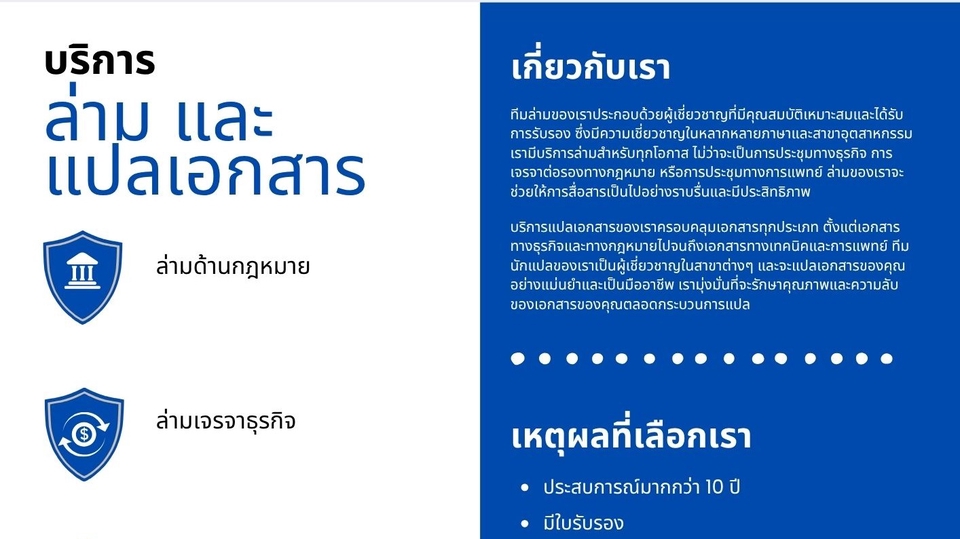 แปลเอกสารทุกรูปแบบและทุกประเภท ทางการ ไม่ทางการ ทางเทคนิคหรือการแแพทย์ ไม่ว่าจะซับซ้อนแค่ไหนก็ยินดีให้บริการ รับประกันคุณภาพ ความแม่นยำ และร่วดเร็ว - ประสบการณ์มากกา่า 10 ปี - มีมาตรการรักษาความปลอดภัยและคลามลับ - บริการที่ครอบคลุม - ราคาที่จับต้องได้