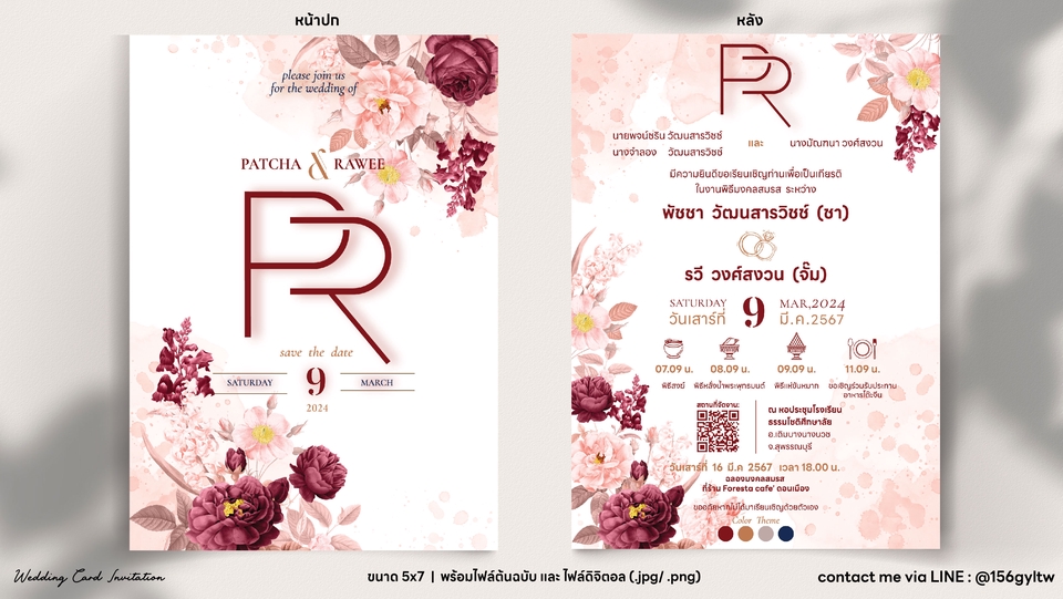 รายละเอียดงาน - ออกแบบ Design Wedding Card - หน้า-หลัง - ออกแบบ Logo ประจำงานแต่ง (โลโก้งานแต่งงาน เจ้าบ่าว-เจ้าสาว) - Free Template การ์ดงานแต่ง size สำหรับลง IG Story ขั้นตอนการทำงาน 1. ลูกค้าแจ้ง รายละเอียดงาน เช่น ข้อความที่จะระบุลงในการ์ด, QR CODE(optional),ตีมงาน/สี พร้อมแนบ สไตล์แบบการ์ด และโทนสีที่ชอบ 2. หลังได้รับการบรีฟจากลูกค้าครบถ้วน จะทำการออกแบบ และส่งแบบให้ตรวจ ภายในเวลาที่กำหนด หากมีการแก้ไขสามารถแก้ไข 2 ครั้งค่ะ 3. ส่ง File งานให้ลูกค้าทาง Email ที่ระบุ