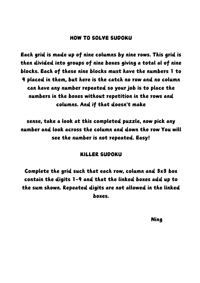 เกมซูโดกุ (Sudoku) เป็นเกมปริศนาเชิงตรรกะ มันไม่ได้เกี่ยวข้องกับการคำนวณทางคณิตศาสตร์โดยตรง แต่เน้นการใช้เหตุผลและการวางแผนอย่างมีระบบ รูปแบบพื้นฐานของซูโดกุคือกริดขนาด 9x9 ที่แบ่งออกเป็นกรอบย่อยขนาด 3x3 รวมทั้งหมด 9 กรอบย่อย กฎการเล่นซูโดกุ ตัวเลขในแต่ละแถว : ในแต่ละแถวของกริดต้องมีตัวเลขตั้งแต่ 1 ถึง 9 โดยไม่ซ้ำกัน ตัวเลขในแต่ละคอลัมน์ : ในแต่ละคอลัมน์ต้องมีตัวเลขตั้งแต่ 1 ถึง 9 โดยไม่ซ้ำกัน ตัวเลขในแต่ละกรอบย่อย : ในแต่ละกรอบย่อย 3x3 ต้องมีตัวเลขตั้งแต่ 1 ถึง 9 โดยไม่ซ้ำกัน วิธีการเล่น เริ่มต้นด้วยกริดที่บางช่องจะมีตัวเลขใส่ไว้ให้แล้ว (เรียกว่า ตัวเลขเริ่มต้น) ผู้เล่นจะต้องเติมตัวเลขที่เหลือลงในช่องว่าง โดยยึดตามกฎทั้งสามข้อ เกมจะสำเร็จเมื่อทุกช่องของกริดเต็มและตัวเลขในทุกแถว ทุกคอลัมน์ และทุกกรอบย่อยเป็นไปตามกฎ ประโยชน์ของการเล่นซูโดกุ - ช่วยพัฒนาทักษะการคิดเชิงตรรกะ - เพิ่มสมาธิและความอดทน - เป็นกิจกรรมที่ช่วยคลายเครียดและฝึกสมอง - รูปแบบและความยาก ซูโดกุมีหลายระดับ ง่าย ปานกลาง และ ยาก ขั้นตอนการทำงาน 1. พูดคุย สอบถามรายละเอียด ปรึกษาเกี่ยวกับข้อมูลของงาน 2. หากลูกค้าอยากปรับแก้งาน สามารถแจ้งได้เลย 3. ชีทใบงานทำเสร้จสมบูรณ์ สามารถปริ้นในงานได้เลย หลังจากลูกค้าชำระเงิน 4. ส่งมอบงานให้ลูกคจะได้รับเป็นไฟล์ Jpg, Pdf ( สำหรับส่งปริ้น )