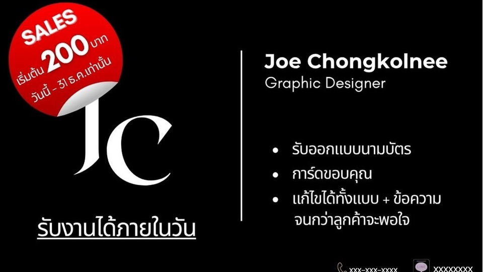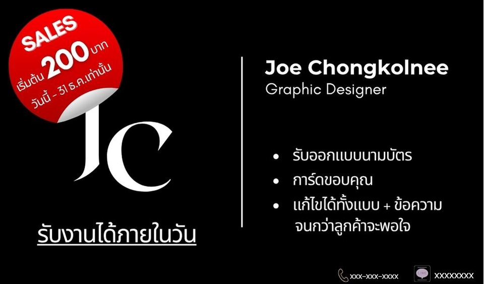 - รับงานออกแบบนามบัตร การ์ดขอบคุณ การ์ดแสดงความยินดี ตามความต้องการของลูกค้า - เพียงลูกค้าแจ้ง แนว แบบ สไตล์ ที่ต้องการ - สร้างงานเป็นแบบให้ลูกค้าเลือก 3 แบบ เมื่อลูกค้าเลือกแบบที่ต้องการแล้ว จะลงรายละเอียดต่างๆที่ลูกค้าต้องการบนนามบัตร-การ์ด - ใช้ระยะเวลาทำงาน 1 วัน (สำหรับงานรอบแรก หากมีการแก้ไข) - สามารถแก้ไขงานได้ 3 ครั้ง ***ราคาเริ่มต้น 500 บาท ลองทักเพื่อรับรายละเอียดได้ค่ะ*** ขั้นตอนการทำงาน 1. รับบรีฟแบบ+ข้อความ จากคุณลูกค้า ออกใบเสนอราคา 2. สร้างแบบให้เลือก 3 แบบ คุณลูกค้าเลือกแบบ 1 แบบ 3. ใส่รายละเอียดในแบบที่คุณลูกค้าเลือก นำส่งงานให้คุณลูกค้า 4. ปรับเปลี่ยน แก้ไข แบบ+ข้อความ ตามความต้องการคุณลูกค้า แก้ไขได้จำนวน 3 ครั้ง 5. แบบปกติ ระยะเวลาการทำงาน 1 วัน สำหรับการส่งงานครั้งแรก (หากมีการแก้ไข) (ไม่นับวันชำระเงิน) 6. แบบด่วน!!! ภายในวันชำระเงิน สำหรับการส่งงานรอบแรก (หากมีการแก้ไข) (ชำระเงินก่อน 15.00 น.)