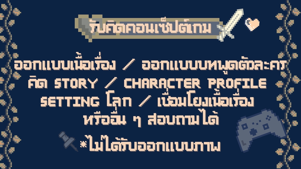 รับคิดคอนเซ็ปต์เกม ออกแบบเนื้อเรื่อง / ออกแบบบทพูดตัวละคร คิด Story / Character Profile Setting โลก / เชื่อมโยงเนื้อเรื่อง หรืออื่น ๆ สอบถามได้ *ไม่ได้รับออกแบบภาพ ขั้นตอนการทำงาน 1. รับบรีพรูปแบบงานที่ลูกค้าต้องการ 2. สอบถามเรื่องรายละเอียด ระยะเวลา 3. ตกลงราคา 4. เริ่มทำงานให้ลูกค้า