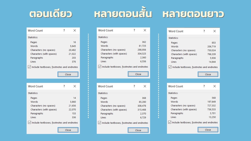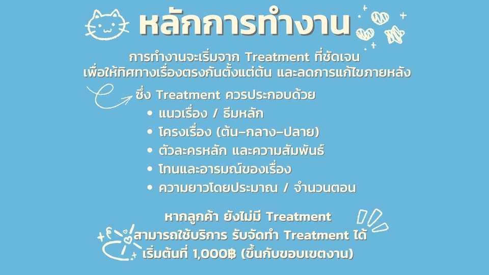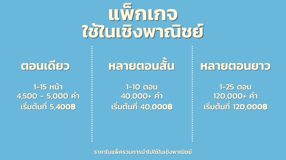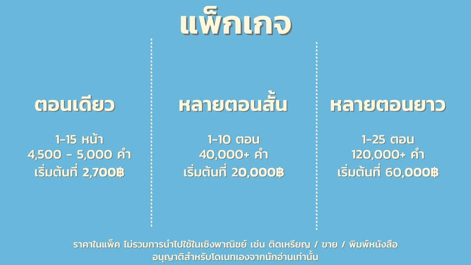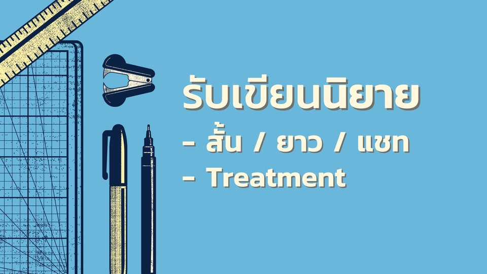 รับเขียนนิยาย นิยายสั้น / นิยายยาว / นิยายแชท / Treatment ชายหญิง / ชายชาย / หญิงหญิง / อื่น ๆ รับเขียน NC 18+ / 20+ ประเภทงานที่ถนัด Sci-fi / Fantasy / Romantic / Action / Drama / Horror ประเภทงานที่ไม่ได้รับ จีน / จีนโบราณ *ไม่รับงานเร่ง *ไม่รับเขียนแฟนฟิคชั่น *แก้ไขได้ 2 ครั้ง *ราคาที่โชว์ยังไม่รวมค่าบริการของ fastwork *ราคาสามารถยืดหยุ่นตามความยาวและความยากของงาน สนใจสอบถามก่อนได้นะคะ ขั้นตอนการทำงาน 1. พูดคุยเบื้องต้นสอบถามความต้องการ ระยะเวลาส่งงาน 2. ประเมินราคา เริ่มดำเนินการ 3. ส่งตัวอย่างงานให้ลูกค้า 4. ปรับแก้ตัวอย่างตามความต้องการของลูกค้า 5. ส่งงานตัวจริงให้ลูกค้า