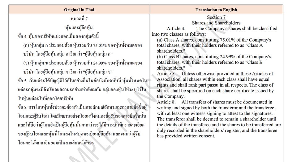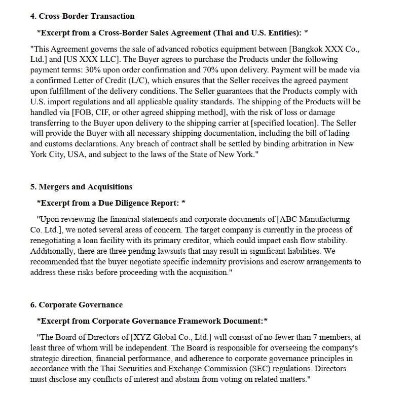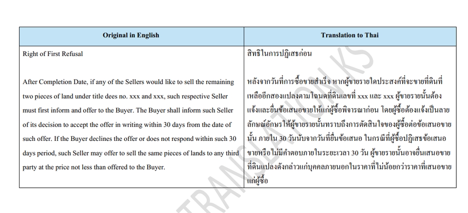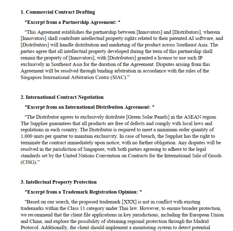 Services we offer (both in Thai and English): - Precise Translation Services: Accurate legal translations that maintain the integrity of your documents. -Legal Consultations: Personalized advice to guide you through complex legal matters. -Contract Drafting and Review: Clear, actionable contracts to protect your interests. -Compliance and Regulatory Guidance: Keeping you in line with the law, locally and globally. -Risk Management: Helping you anticipate, assess, and manage risks to improve your decision-making capabilities. ขั้นตอนการทำงาน 1. ลูกค้าติดต่อพร้อมส่งรายละเอียดงานที่ต้องการ เพื่อประเมินเนื้องาน ราคา และเวลาการทำงาน 2. เจ้าหน้าที่จะติดต่อกลับเพื่อเสนอราคาและเวลาการทำงาน หรืออาจข้อมูลเพิ่มเติม 3. หากลูกค้าตกลง แจ้งกลับขอให้เริ่มงาน 4. เริ่มทำงานทันทีหลังจากลูกค้าตกลงให้เริ่มงาน