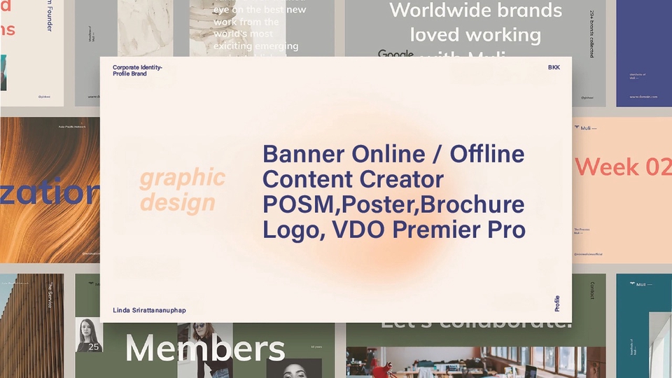 ออกแบบสื่อสิ่งพิมพ์ทั้งออนไลน์และออฟไลน์ เช่น โลโก้ แบรนด์ดิ้ง โซเชียลมีเดีย อินโฟกราฟิก ตัดต่อวีดีโอด้วยโปรแกรมพรีเมียร์โปร และอื่นๆ ด้วยการพัฒนางานให้ดีที่สุดในทุกขั้นตอน และราคาตาม Bujjet ของลูกค้า ขั้นตอนการทำงาน 1. ลูกค้าส่งบรีฟรายละเอียดงาน รูปแบบ คอนเทนต์ และสไตล์ที่ต้องการเพื่อประเมินราคา 2. ลูกค้าส่ง Source File ที่จำเป็น เช่น โลโ้ก้ Brand ci(ถ้ามี) ข้อมูลรายละเอียดต่างๆ 3. เสนอผลงาน โดยใช้เวลา 2-5 วัน สามารถปรับแก้ไขได้ 5 ครั้งโดยแก้จากชิ้นงานดีไซน์ที่เลือกแล้ว 4. ส่ง File AW งานสำเร็จ
