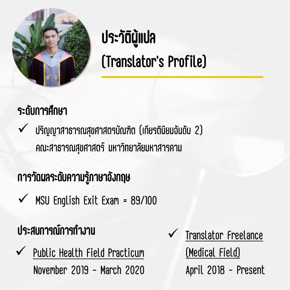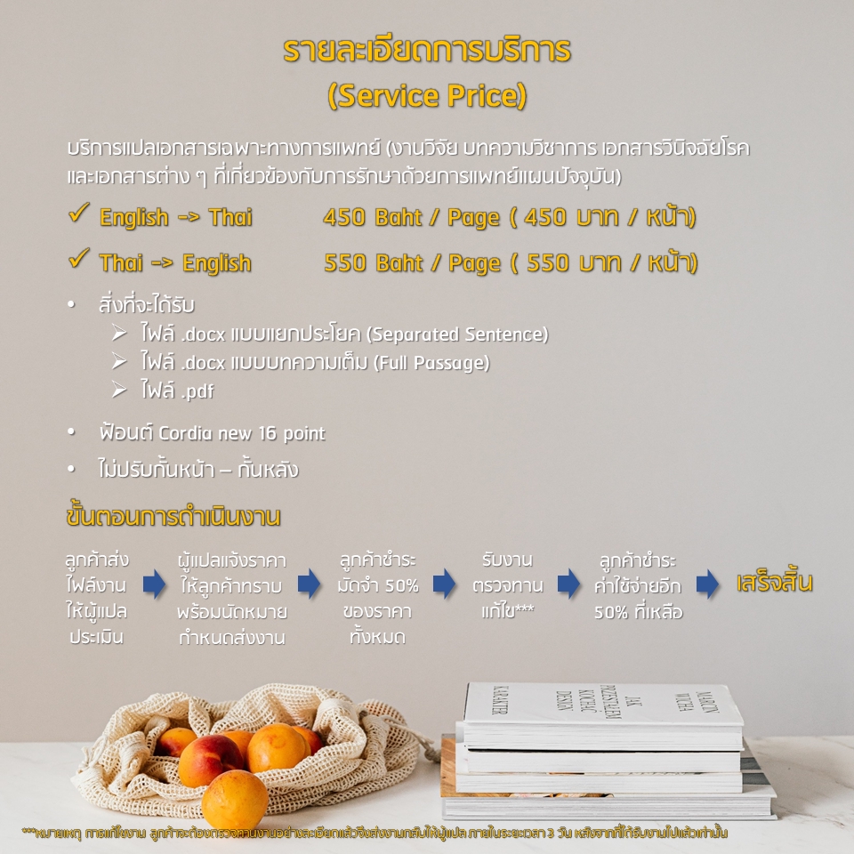 บริการแปลเอกสารวิชาการต่าง ๆ ทางการแพทย์และสาธารณสุข ====== - งานวิจัย / วิทยานิพนธ์ / วารสารวิชาการ - บทความวิชาการ - บทคัดย่อ ====== 📌 แปลโดยผู้แปลประสบการณ์ด้านการแปลบทความวิชาการมากกว่า 5 ปี 📌 สามารถใช้ศัพท์เทคนิคเฉพาะทางให้เข้ากับบทความได้เป็นอย่างดี 📌 มีการตรวจงานอย่างละเอียดก่อนส่งมอบงาน 📌 หมดกังวลเรื่องการใช้เวลาในการแปลด้วยตนเอง ช่วยให้คุณประหยัดเวลาให้ไปทำอย่างอื่นได้มากยิ่งขึ้น!! ====== หากคุณคิดไม่ออกว่าจะเริ่มแปลอย่างไร ไม่ว่าจะเป็น บทคัดย่อ รายงานวิชาการ วิทยานิพนธ์ หรืองานวิจัย ลองปรึกษากับทางเราได้ครับ 😊 ขั้นตอนการทำงาน 1. ส่งไฟล์ต้นฉบับให้นักแปลเพื่อประเมินราคา และระยะเวลาในการแปล 2. นักแปลประเมินราคาและตอบกลับลูกค้า 3. ตกลงการรับบริการแปล 4. ส่งมอบงานแปลให้กับลูกค้า 5. ลูกค้าตรวจสอบความเรียบร้อยของงานและยืนยันการส่งมอบงาน 6. เสร็จสิ้น