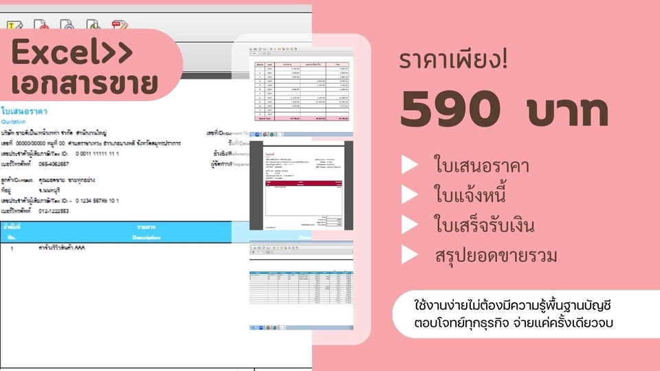 ใช้งานง่ายไม่ต้องมีความรู้พื้นฐานบัญชี ตอบโจทย์ทุกธุรกิจ จ่ายแค่ครั้งเดียวจบ - สามารถ ปรับแต่งให้เหมาะกับธุรกิจของคุณ - ใช้งานได้ทั้ง Excel, Google Sheets - ไฟล์Excel ผูกสูตรคำนวณเรียบร้อยแล้ว - กรอกข้อมูล Sheet เดียว ออกเอกสารได้ 3 รายการ (ใบเสนอราคา/ใบแจ้งหนี้/ใบเสร็จรับเงิน - สรุปยอดขาย รายเดือน แยกประเภทยอดขายที่รับเงินแล้ว กับยอดขายรอเรียบเก็บ